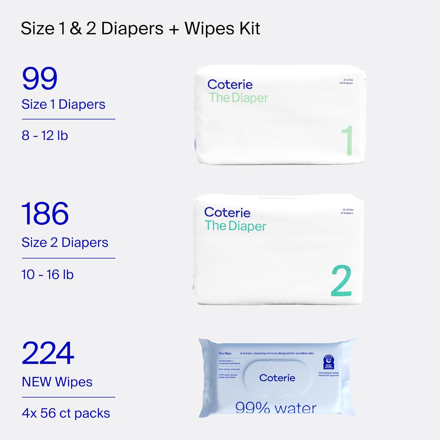 Coterie Baby Wipes + Diapers Kit, Size 1 (99 Count) & Size 2 Diapers (186 Count), 4 Pack (224) Baby Wipes with 99% Water, Plant Based Materials, Hypoallergenic for Sensitive Skin
