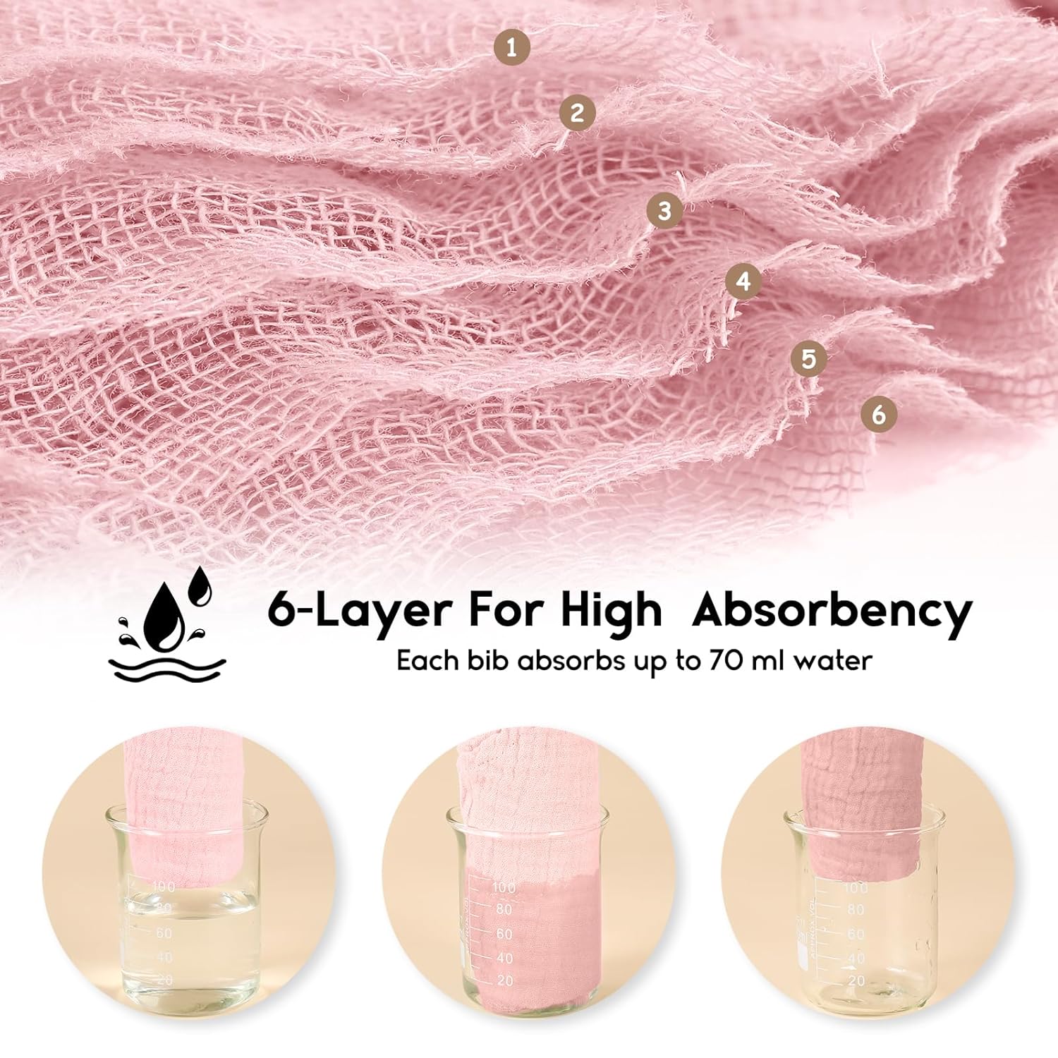 - Super Absorbent : 6 layers of thickened muslin bibs have super absorbency. Each muslin baby bibs can absorb 70ML of clean water. Even if your baby is a heavy drooler, it can be completely absorbed by these bibs, keeping your baby's clothes dry all day long.