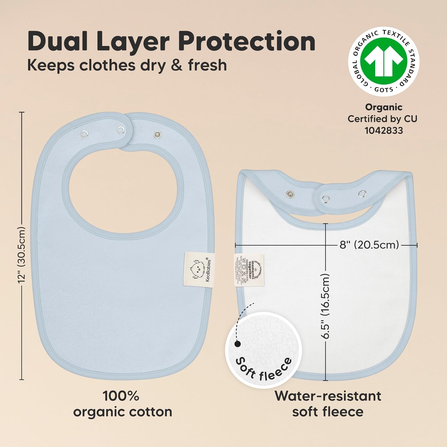 - Super Absorbent - Our organic baby boy and girl bibs are made with 100% organic cotton (GOTS-certified) and backed with water resistant fleece for added absorption. This dual layer design helps to keep your baby clean and fresh all day long. Suitable for newborns, infants, toddlers, heavy droolers and teething babies.