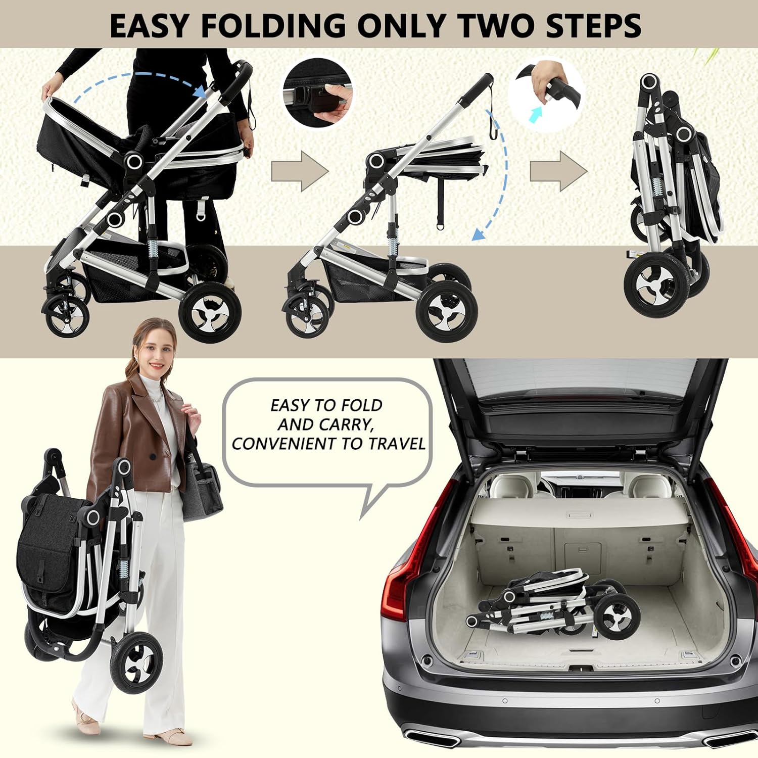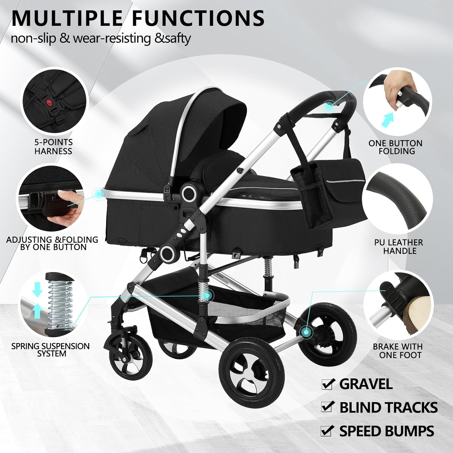 Kinder King 2 in 1 Convertible Baby Stroller, Folding High Landscape Infant Carriage, Newborn Reversible Pram, Adjustable Canopy, Diaper Bag, Anti-Shock Toddler Pushchair Stroller, Black