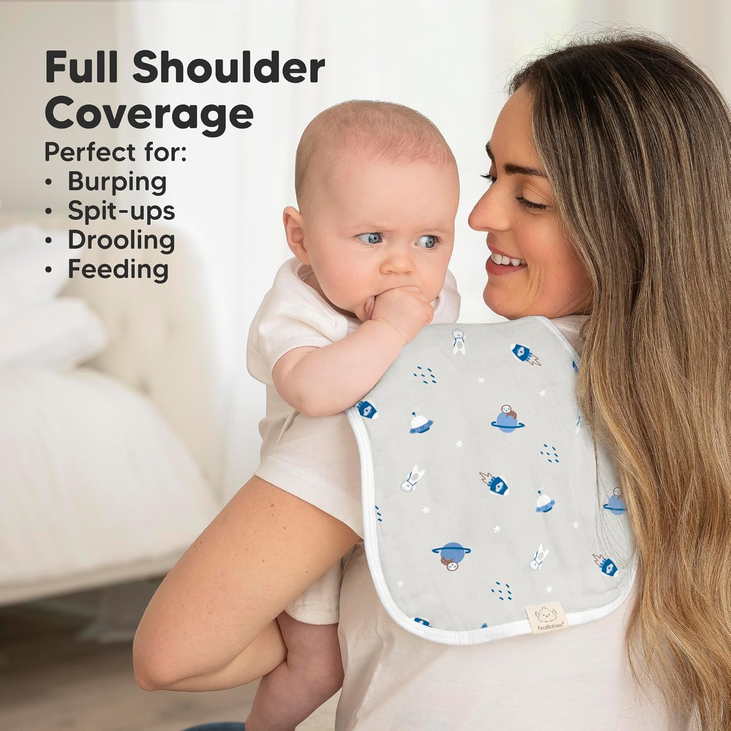 - Maximum Shoulder Coverage - Our burping cloths for babies are specially designed in figure-8 to ensure a secure fit, preventing the burp rags from slipping. Measuring 21" x 10", this neutral burp cloth provides ample coverage for your shoulders.