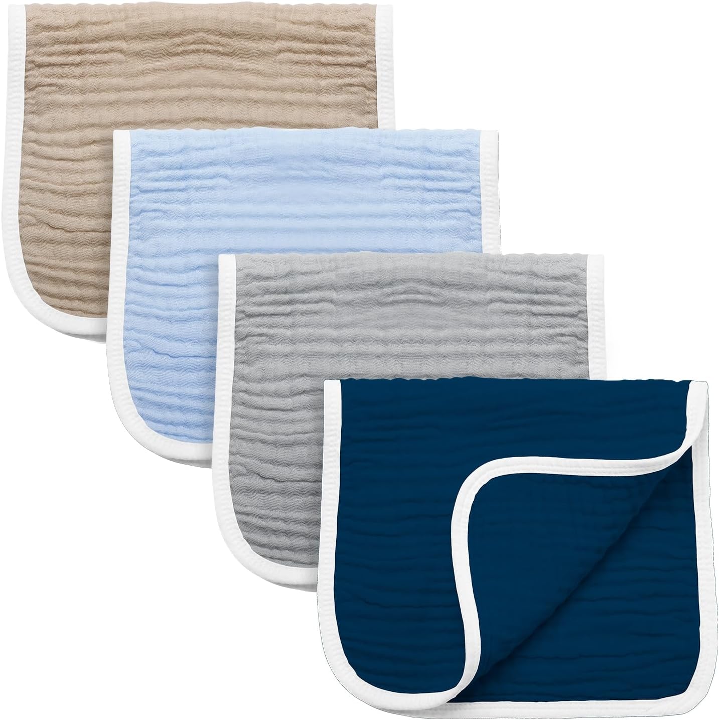 - More Color Choices. There are more lovely colors for you to choose. You can use this muslin burp cloths in many ways, and you can freely combine it according to the situation, like using multiple colors together, or using multiple pieces together to achieve better cleaning and water absorption purpose.