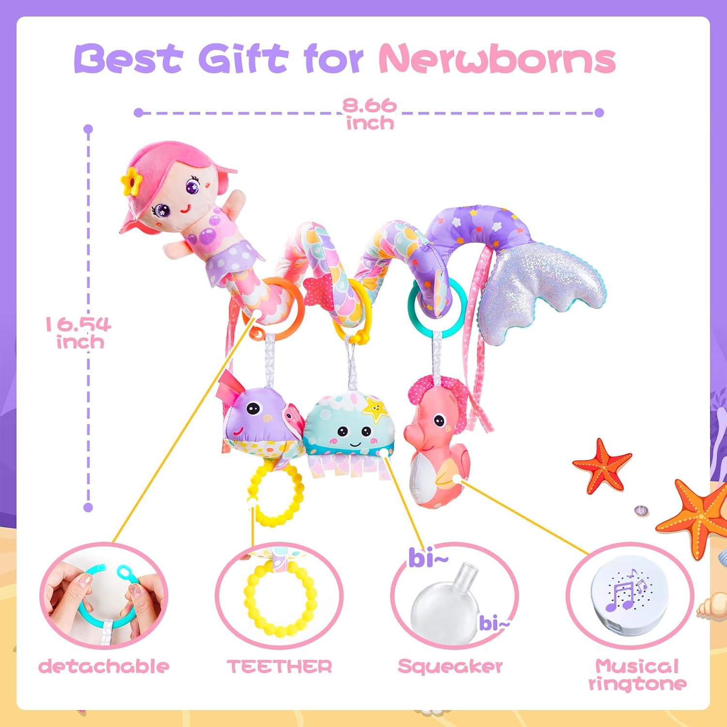 Koty Carseat Toys Hanging, Pink Mermaid Stroller Toys for Babies 0-6 Months, Baby Car Seat Toy with Crinkle, Teether, Music Box, Rattle, BB Squeaker for Babies Boys Girls Gifts (Pink Mermaid)