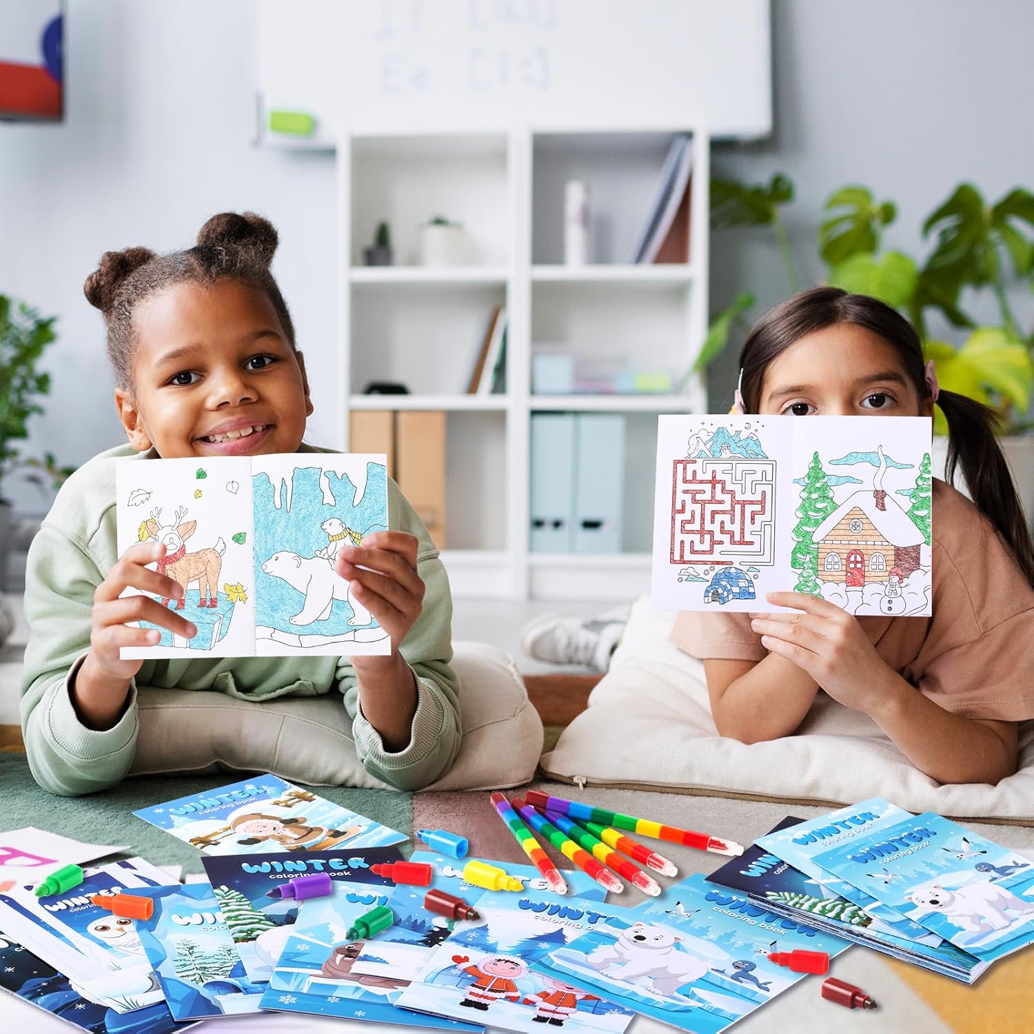 - Suitable Size: each winter coloring book bulk for kids measures about 6.7 x 4.7 inches, which is a good size for kids' little hands. Easy to carry, you can take it outdoors, school, birthday party, travel,picnic and play with friends.The total length of crayons with a transparent cap is 7.1 inch, you can change the position of color and crayons length by yourself