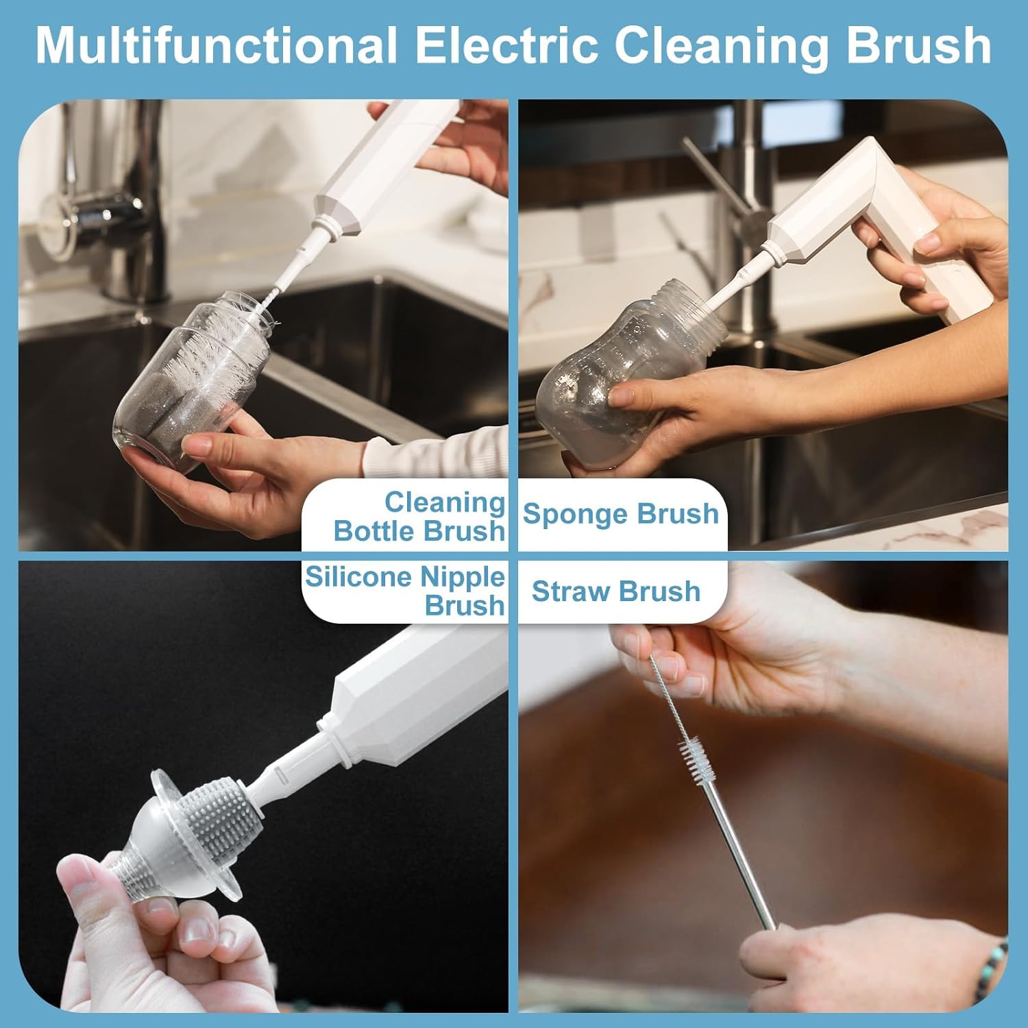 - Safe to Use: The electric bottle brush is made of food grade silicone and ABS, does not contain BPA. Silicone bottle brush can protect bottle nipple, while sponge brushes easy to bubble and clean in all directions, making your daily use more reassuring.