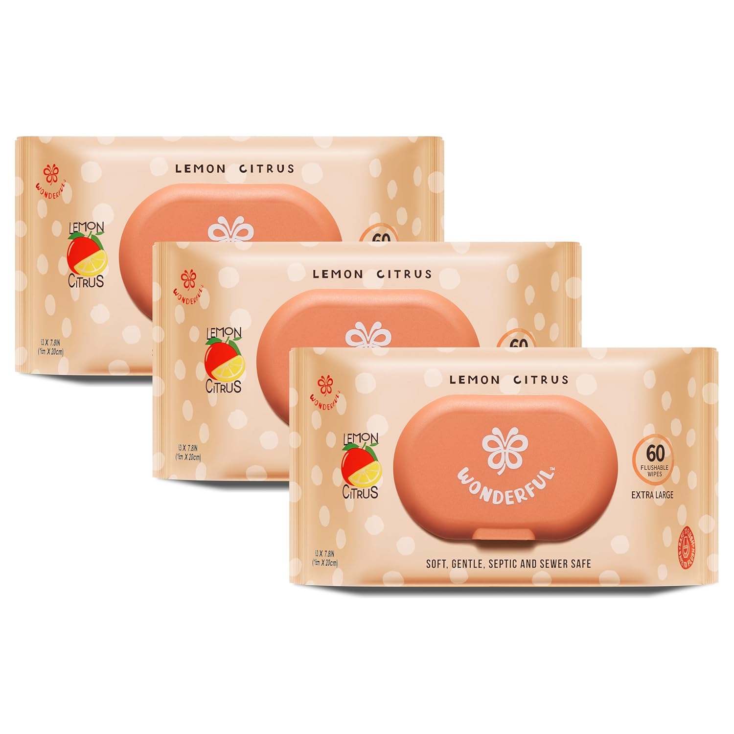WONDERFUL Flushable Butt Wipes, Lemon Citrus 100% Plant-Based Wet Wipes for Adults & Kids; Sewer, Septic Safe; Gentle for Sensitive Skin, Wipes Flushable Pack for Bathroom & Travel, 3-Pack (180 Wipes)