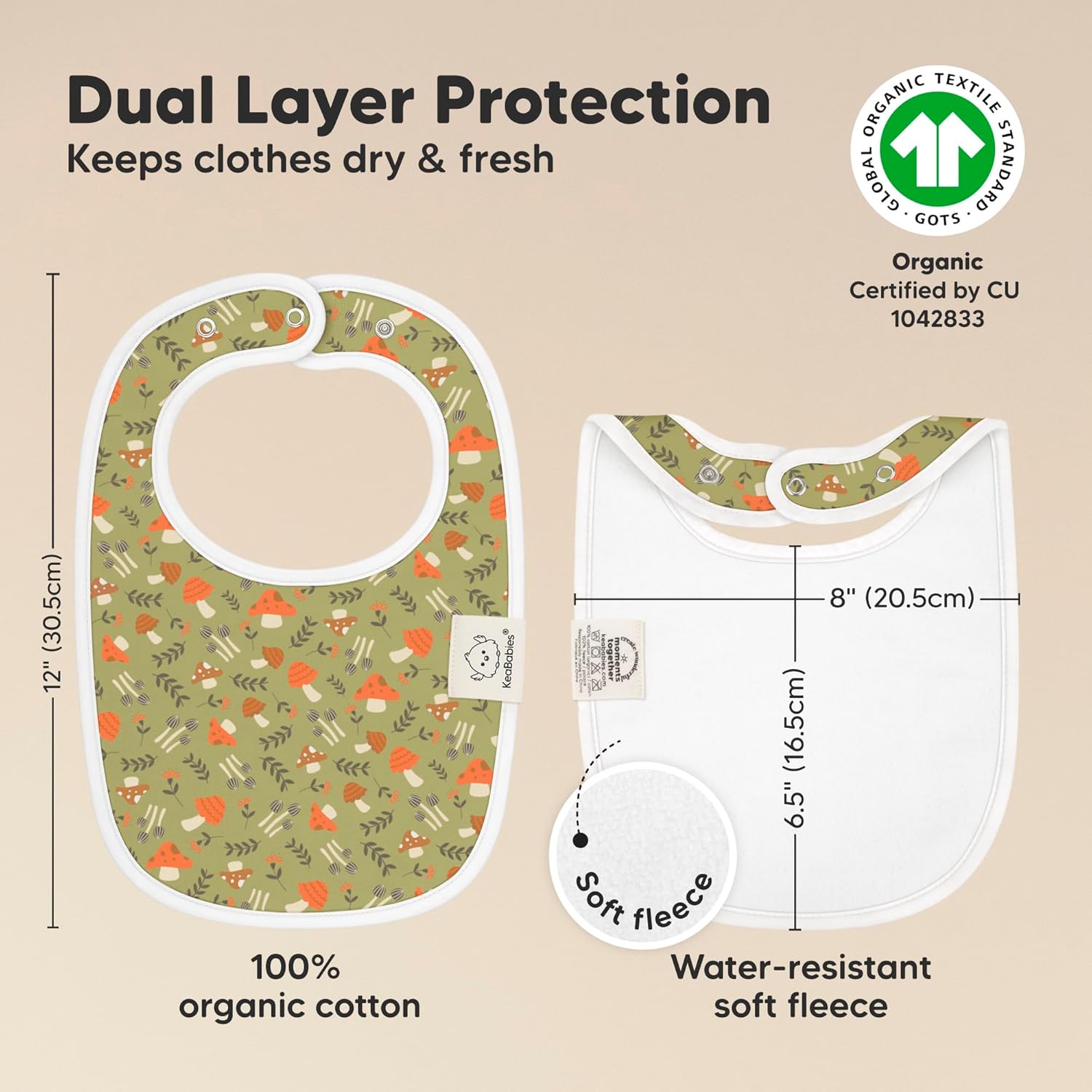 - Super Absorbent - Our organic baby boy and girl bibs are made with 100% organic cotton (GOTS-certified) and backed with water resistant fleece for added absorption. This dual layer design helps to keep your baby clean and fresh all day long. Suitable for newborns, infants, toddlers, heavy droolers and teething babies.