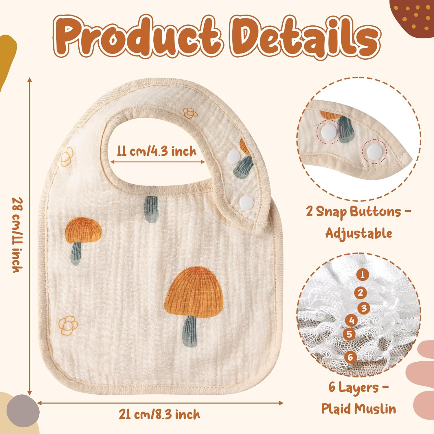- Absorbent: These baby bibs are made of 6 layers of soft cotton fabric. It effectively absorbs liquids and prevents your baby's clothes and skin from getting wet, thus keeping your baby's clothes dry and relieving you of the workload and burden of washing.