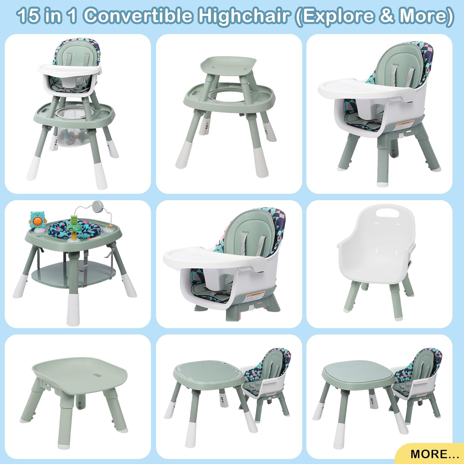 - 2-IN-1 TABLE FOR PLAY & LEARNING: The high chair transforms into a table and chair set with a reversible tabletop. One side is smooth for meals or drawing, while the other side is textured for building blocks, offering both play and learning options in one versatile design.