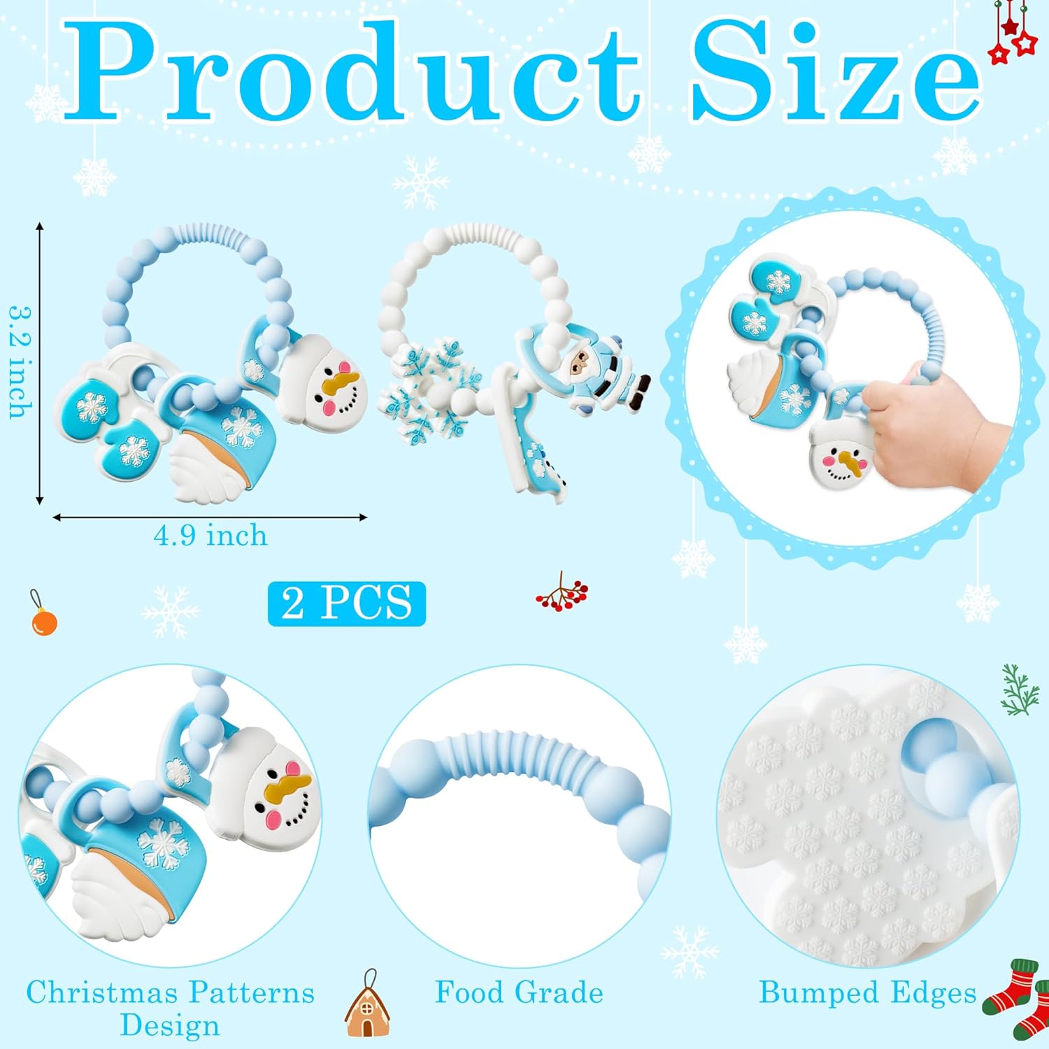 - CHRISTMAS THEMED DESIGN: Christmas teether toys contain 2 cute silicone ring teether with snowflakes, snowman, santa, sleigh, ice-cream and mittens, the bracelet design makes it easier for baby to grip. These Christmas teethers are loved by both boys and girls because they not only meet baby's teething needs, but also help them expand their knowledge of new things and add to the holiday spirit!