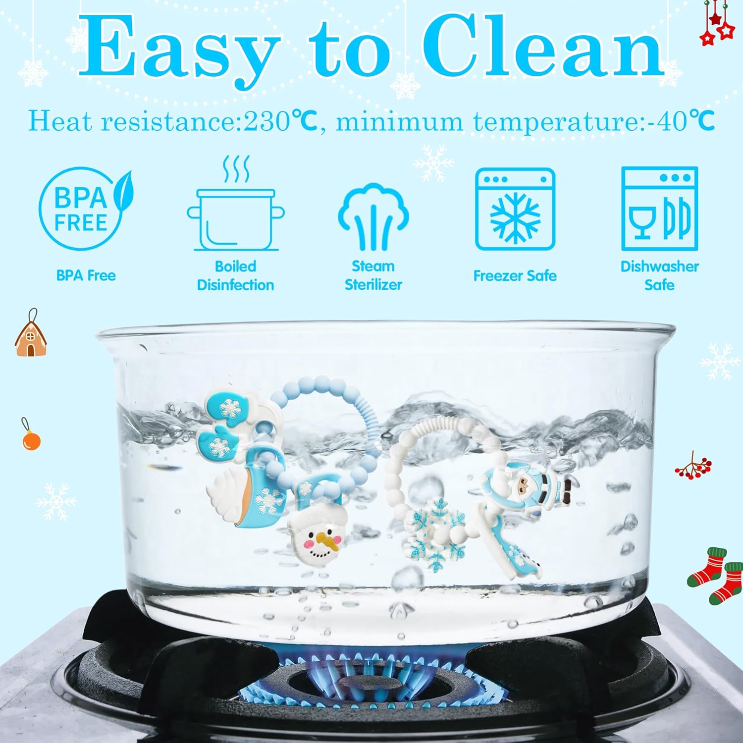 - EASY TO CLEAN: Before using our teething toys, it is recommended to sterilize them in boiling water for 2-3 minutes. After each use, they can be easily cleaned in the dishwasher or with warm soapy water. Our snowman silicone teething toys are heat resistant from -40°C to 230°C and can be boiled, autoclaved or refrigerated, so you can use them with confidence and wash them easily.