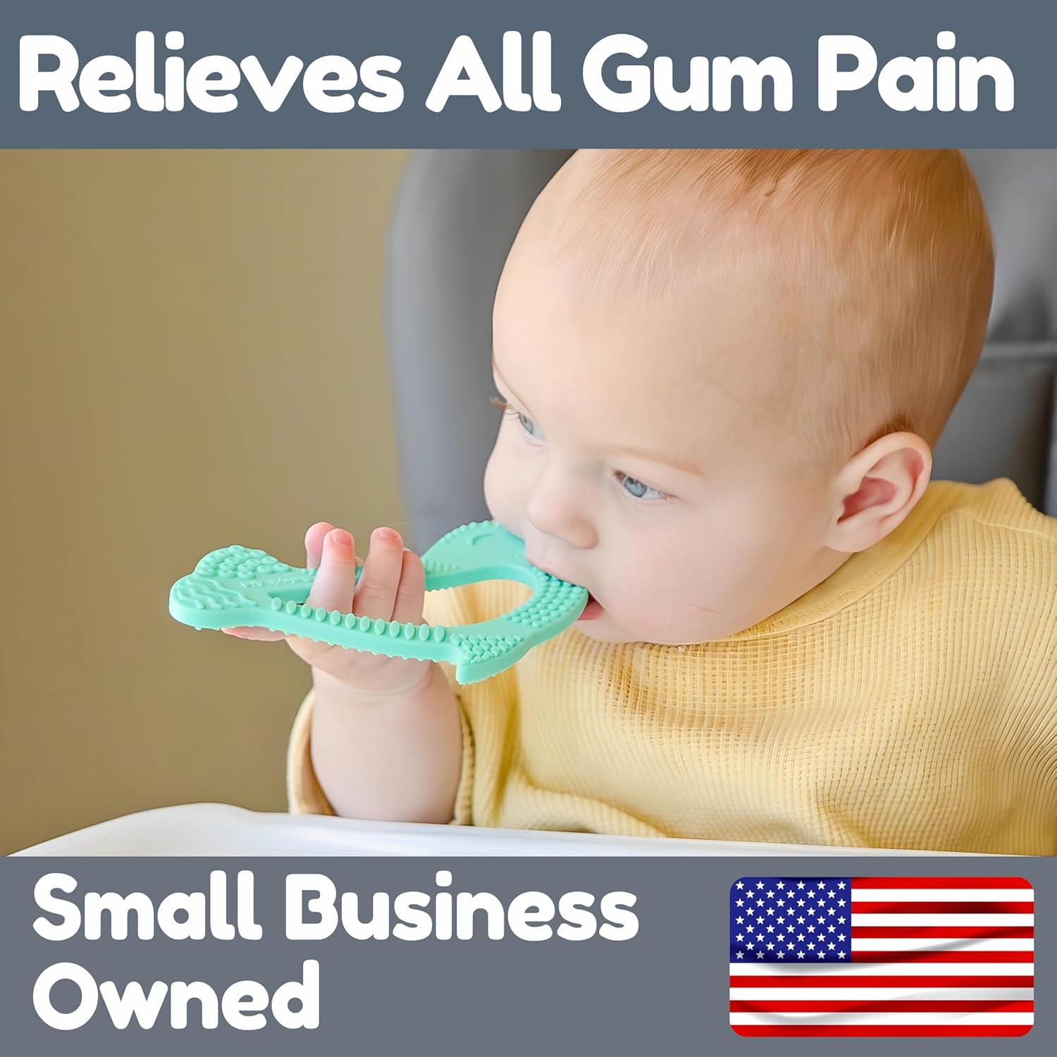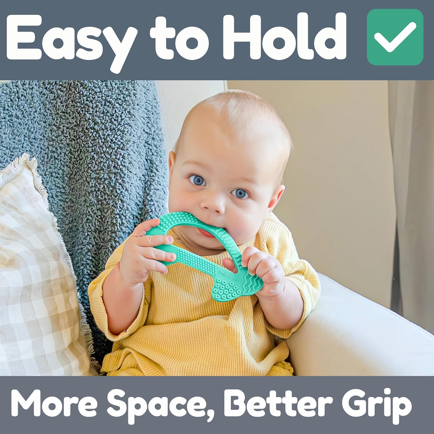 - 100% safe, BPA-free silicone: Our silicone baby teether, available in Aqua Mint, Blueberry, Olive, and Bubblegum, is free from harmful substances and thoroughly tested to provide peace of mind for parents. Crafted from food-grade silicone, this non-toxic teething toy guarantees a safe chewing experience for your little one.
