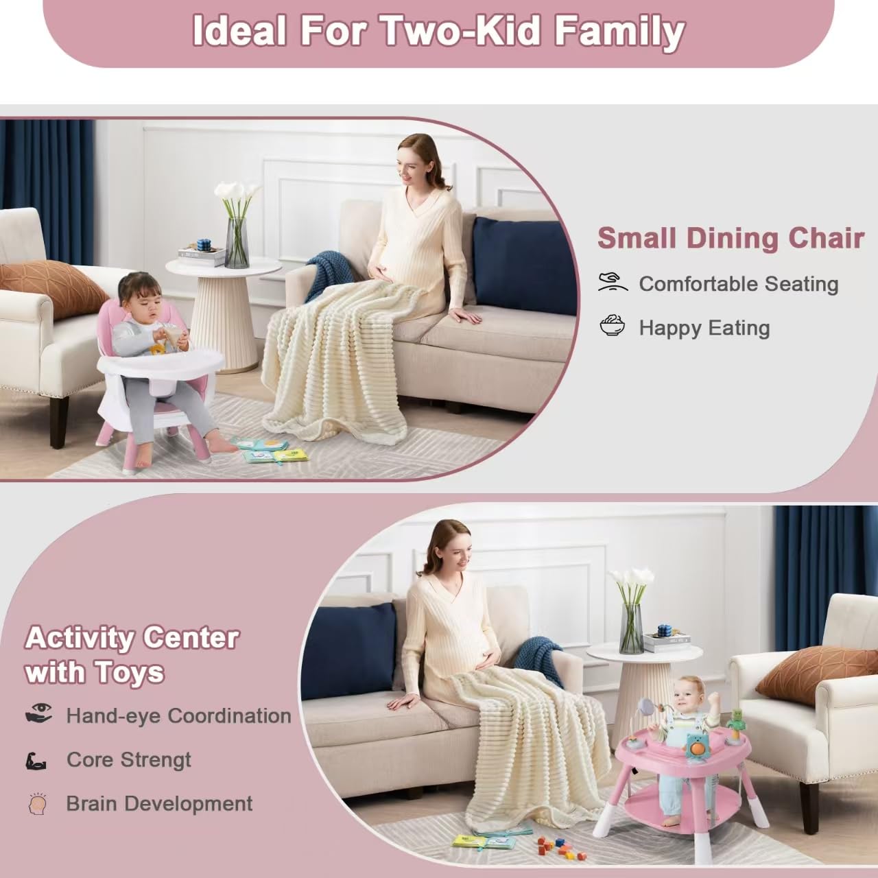 - 【Booster Seat & Activity Center with Toys】Our highchair can split into 2 parts for 2 children to use simultaneously. One part is a booster seat with adjustable straps, securely fitting most dining chairs. Thanks to the removable tray, PU cushion and safety harness, it can be turned into a floor seat, feeding chair, or toddler stool throughout your child's growth. The other part is a play center with a 360-degree rotating seat, interactive toys and a height-adjustable bouncing board for baby to sit, swivel, bounce and play, promoting hand-eye coordination, core strength and brain development.