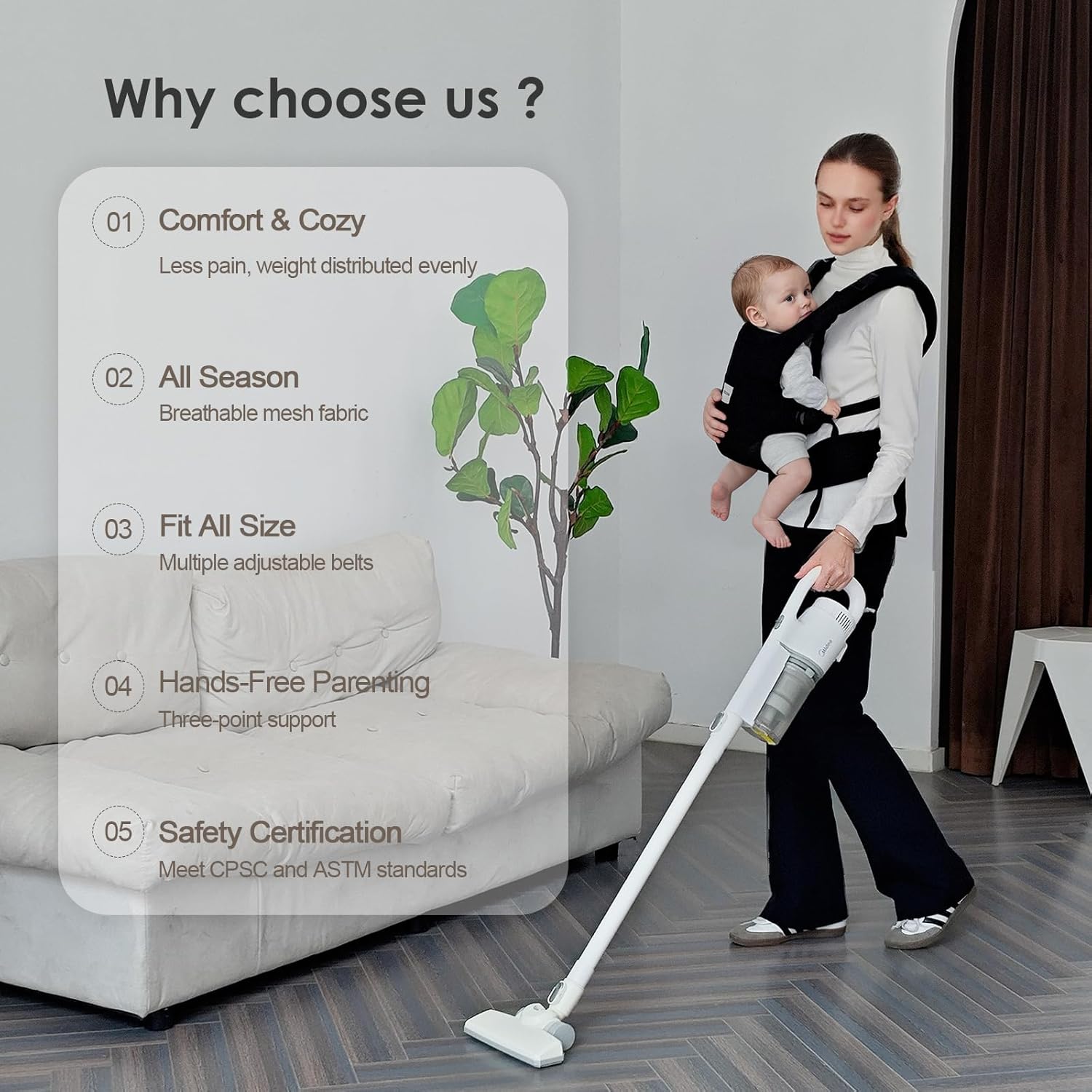 Baby Carrier Newborn to Toddler, Easy Adjustable Toddler Carrier for 7-30lbs, Baby Holder Wrap Carrier, Breathable Mesh Fabric Infant Kangaroo Hip Carriers with Lumbar Support, Black