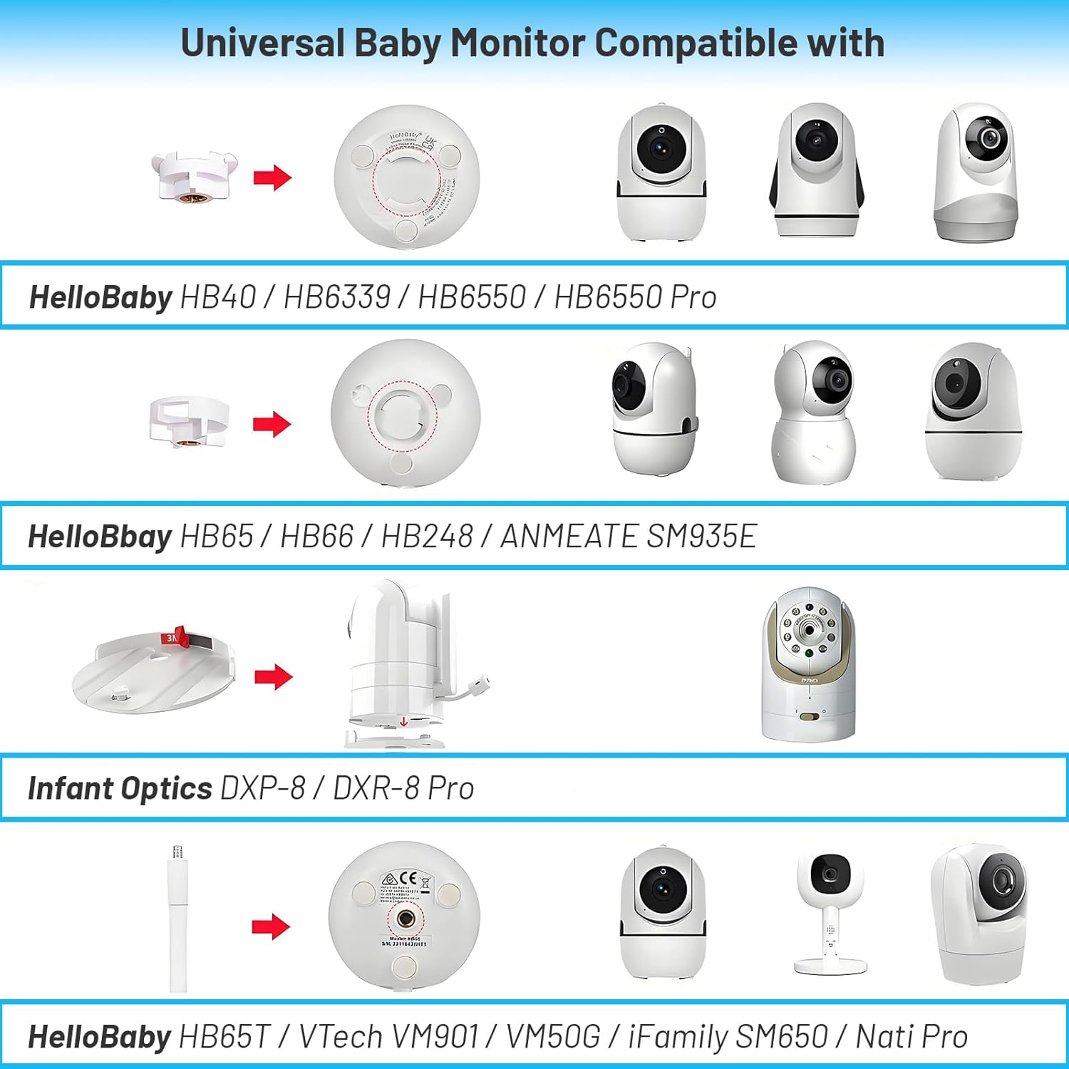 - 1.【Widely Compatibility】 Perfectly fit for your baby monitor. Compatible with the most baby monitors.Compatible with HelloBaby HB6550pro/HB6560/HB6339/HB40/HB6081/HB65/HB6250/HB6351/HB66,Infant Optics DXR-8/8Pro,Nanit,OKAIDI OD8052,UKSUP, ,Owlet Cam 1 Baby Monitor etc. And any cameras with 1/4 screw mount.(NOTE: Please check your camera carefully before shopping)