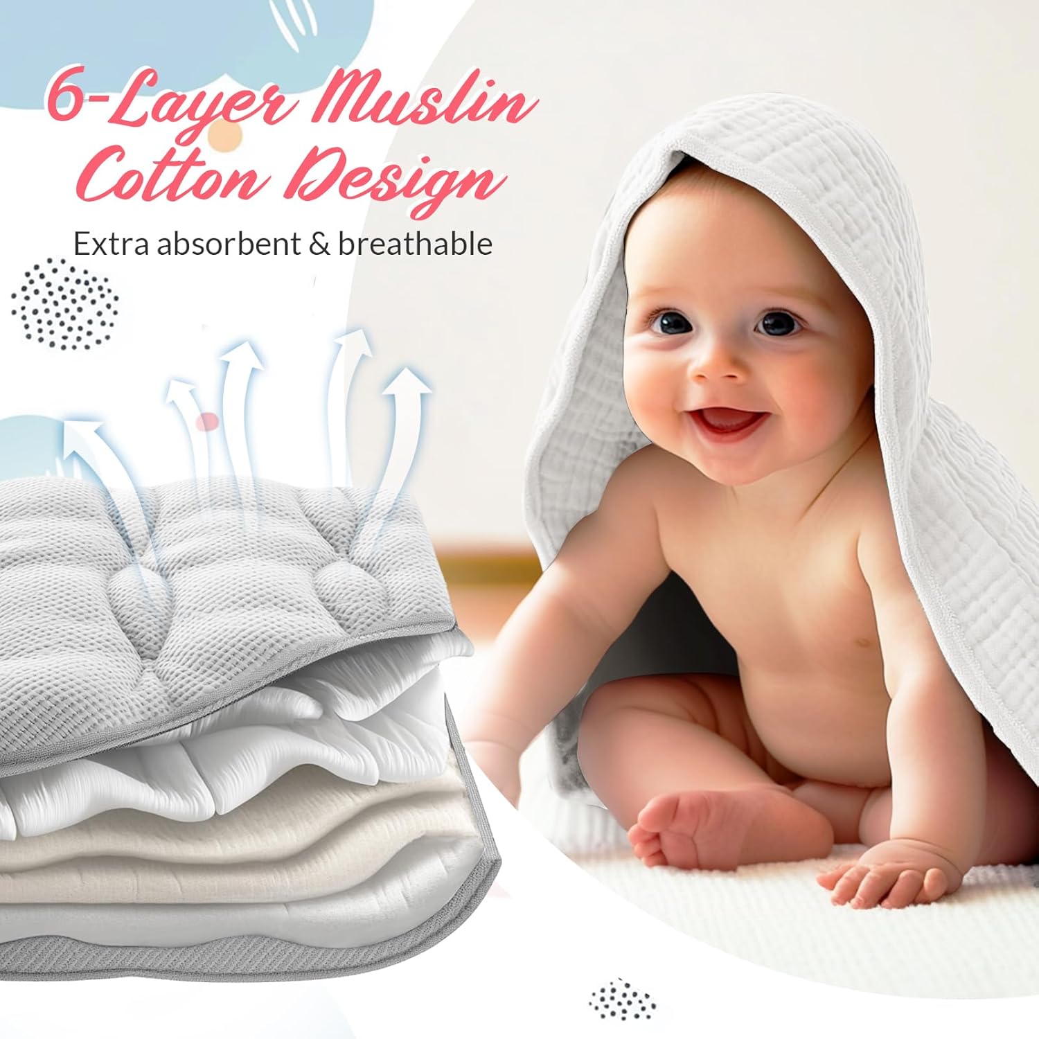 - Soft and Absorbent: the newborn bath towels set boast 6 layers of muslin cotton, soft and comfortable to the touch, easy to machine wash; The quality muslin baby towels help to quickly remove moisture from the skin, keeping your newborn baby warm, dry and cozy after bath, and they are extremely gentle against baby's delicate skin