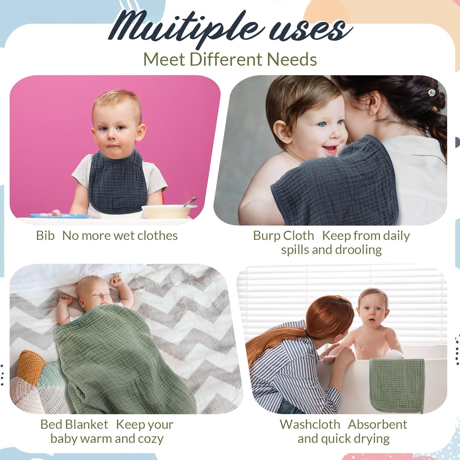 - Ideal Size: the baby bath towel measures about 32 x 32 inches, which is big enough to cover your baby well, the maslin baby washcloth measures about 19.7 x 7.9 inches for daily grooming, and the baby bib measures about 11.9 x 8.3 inches to keep clothes dry from tons of drool; This baby bath set is suitable for newborns, infants, toddlers, and small kids up to 3 years old
