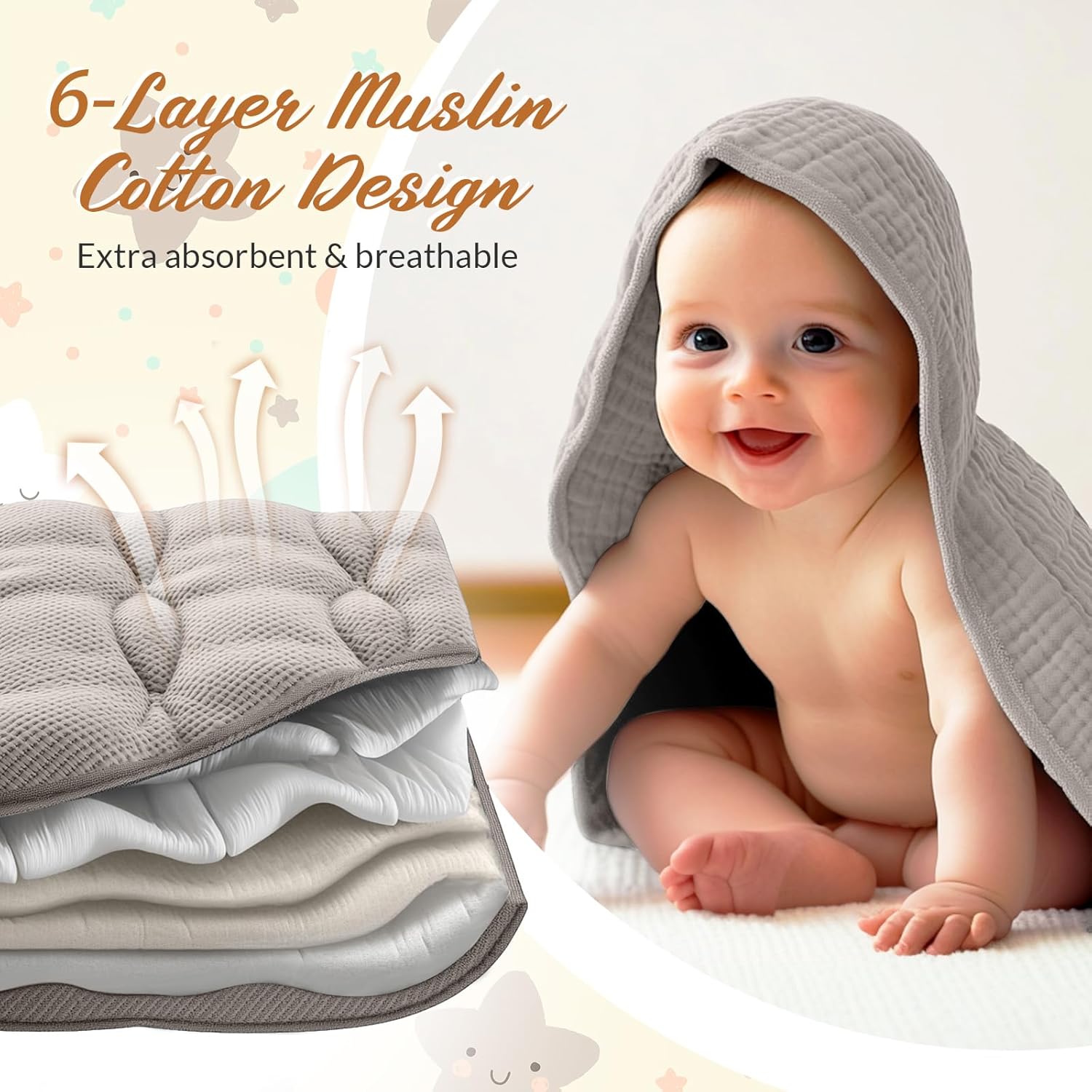 - Soft and Absorbent: the newborn bath towels set boast 6 layers of muslin cotton, soft and comfortable to the touch, easy to machine wash; The quality muslin baby towels help to quickly remove moisture from the skin, keeping your newborn baby warm, dry and cozy after bath, and they are extremely gentle against baby's delicate skin
