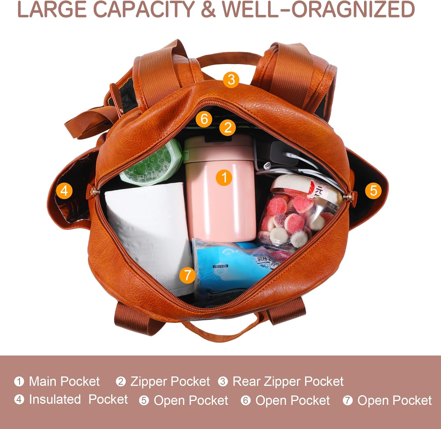 Stylish Diaper Bag Backpack, Leather Large Capacity Travel Baby Diaper Bag Tote for Mom Dad, Handbag shoulder bag, Waterproof, Lightweight Brown