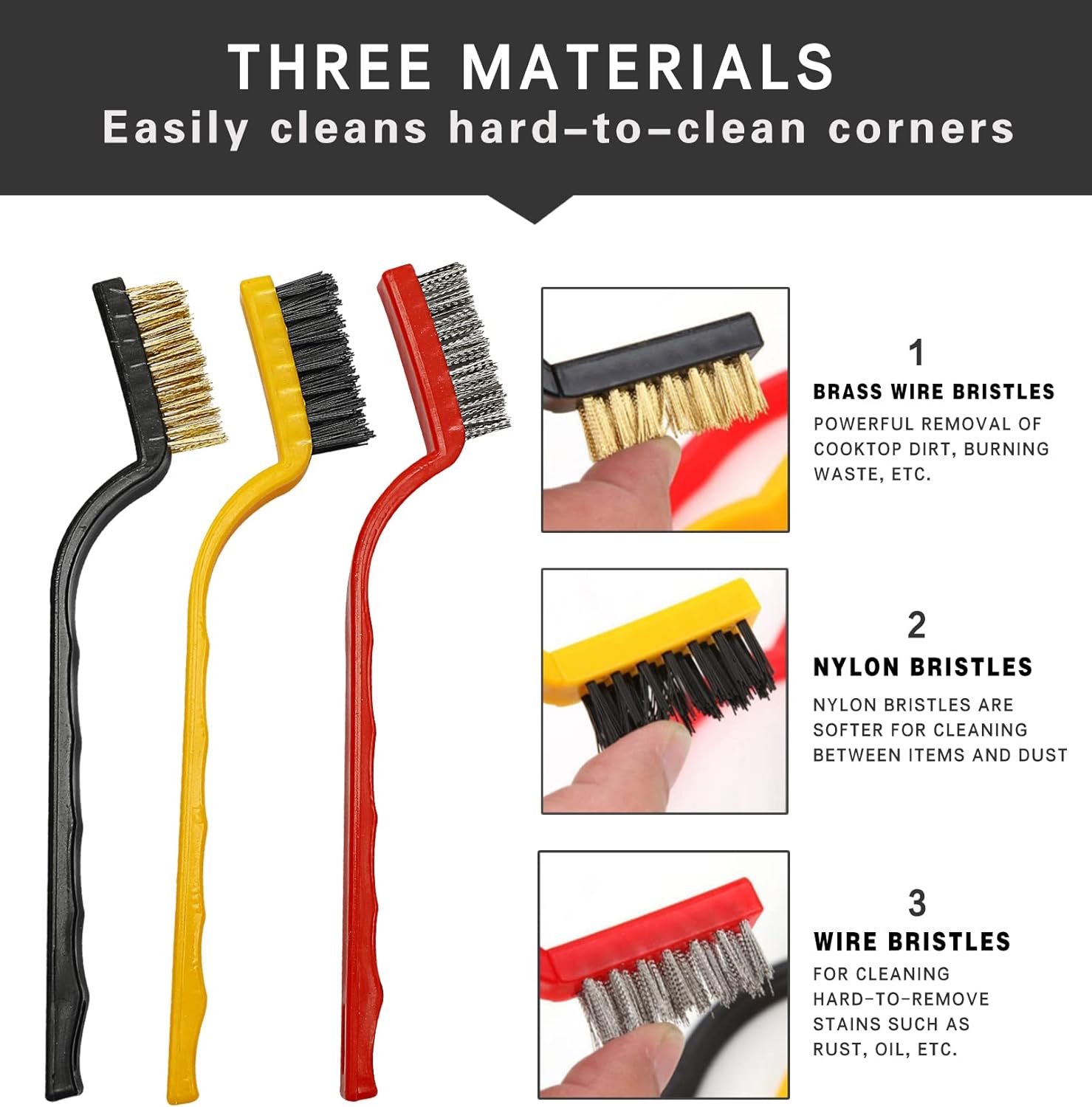 - Multifunctional Kitchen Cleaning Brush: There are 3 stovetop cleaning brushes: copper wire brush, nylon brush, and wire brush. The kitchen cleaning scrubbing brush is made of high-quality stiff bristles, which are not easy to squash and curve, and are long-lasting. The versatile scrubber has a hanging hole design at the end, so you can hang it up for storage, saving space and making it easy to dry
