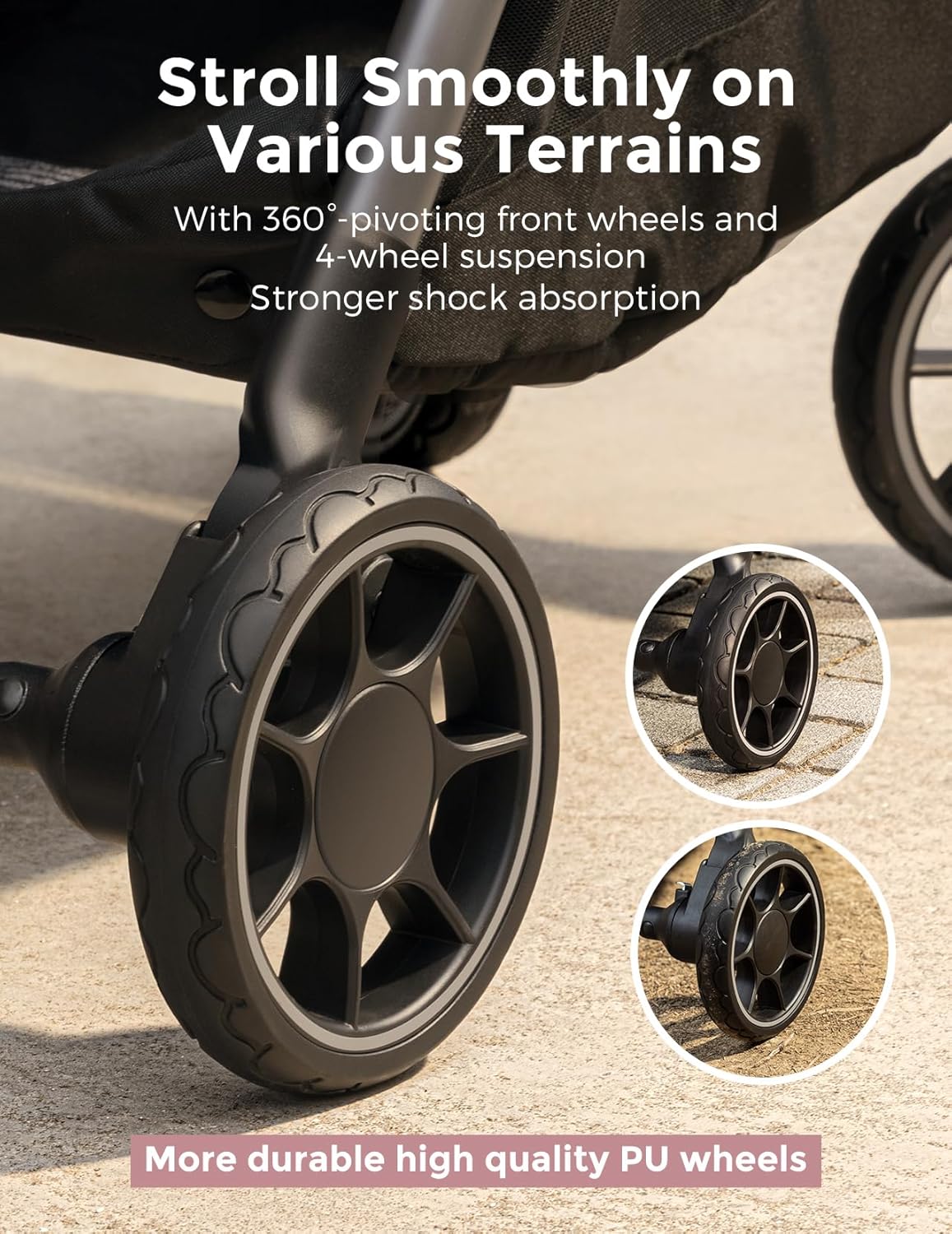 - Smooth and Comfy Ride: Steer smoothly in any direction with the 360-degree swiveling front wheels; all-wheel suspension absorbs shock on bumpy roads for a comfortable ride; extendable UPF50+ canopy with vented peekaboo window(If the canopy blocks the baby's face, you can tuck the extension inside), adjustable recline and leg rest, and five-point harness combine to create a cozy and safe haven for baby on the go.