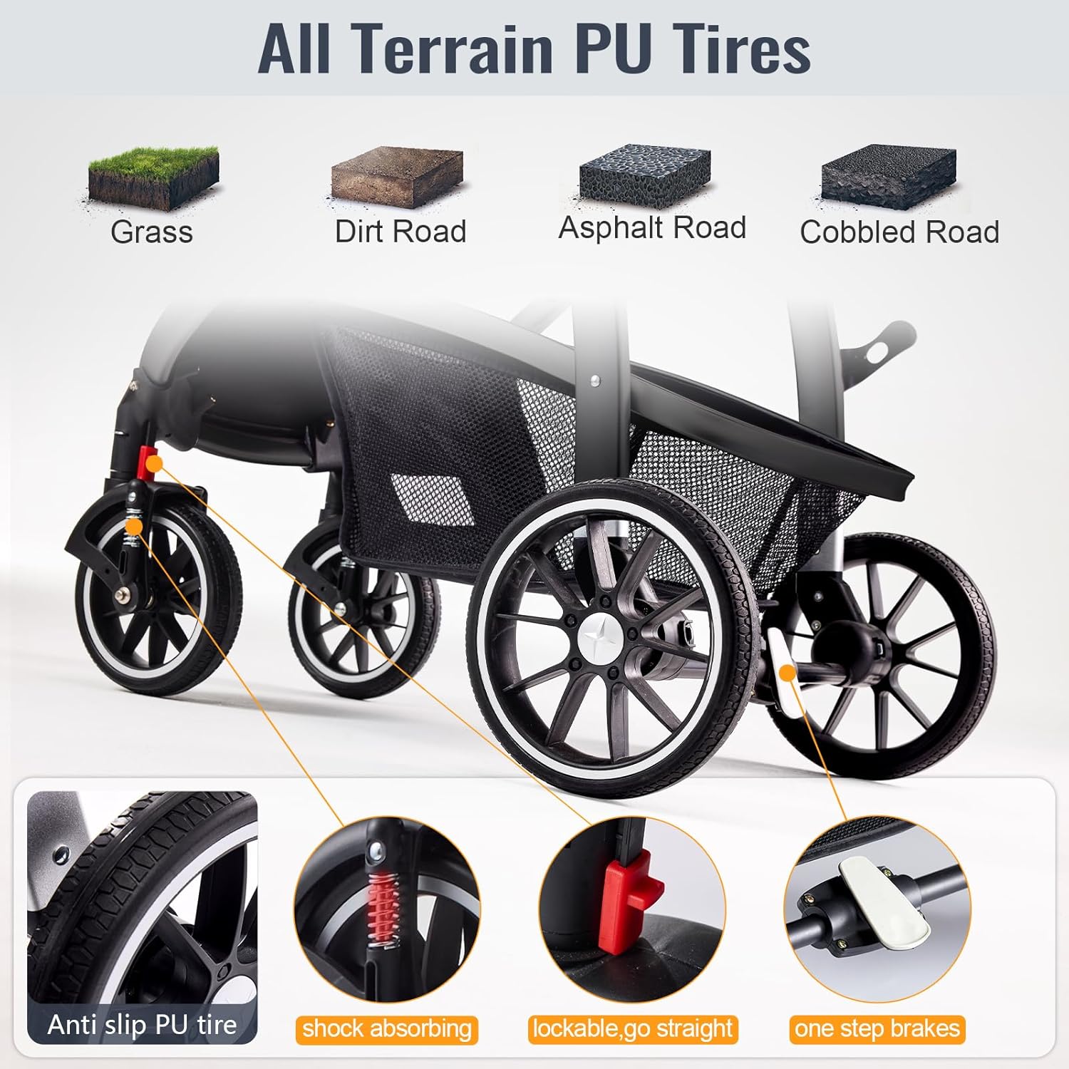 - SAFETY DESIGN: The newborn stroller is equipped with 5-point harnesses to keep the baby secure. The pram stroller also features a one-foot brake, shock absorbers, and a sun canopy to enhance safety in different conditions.