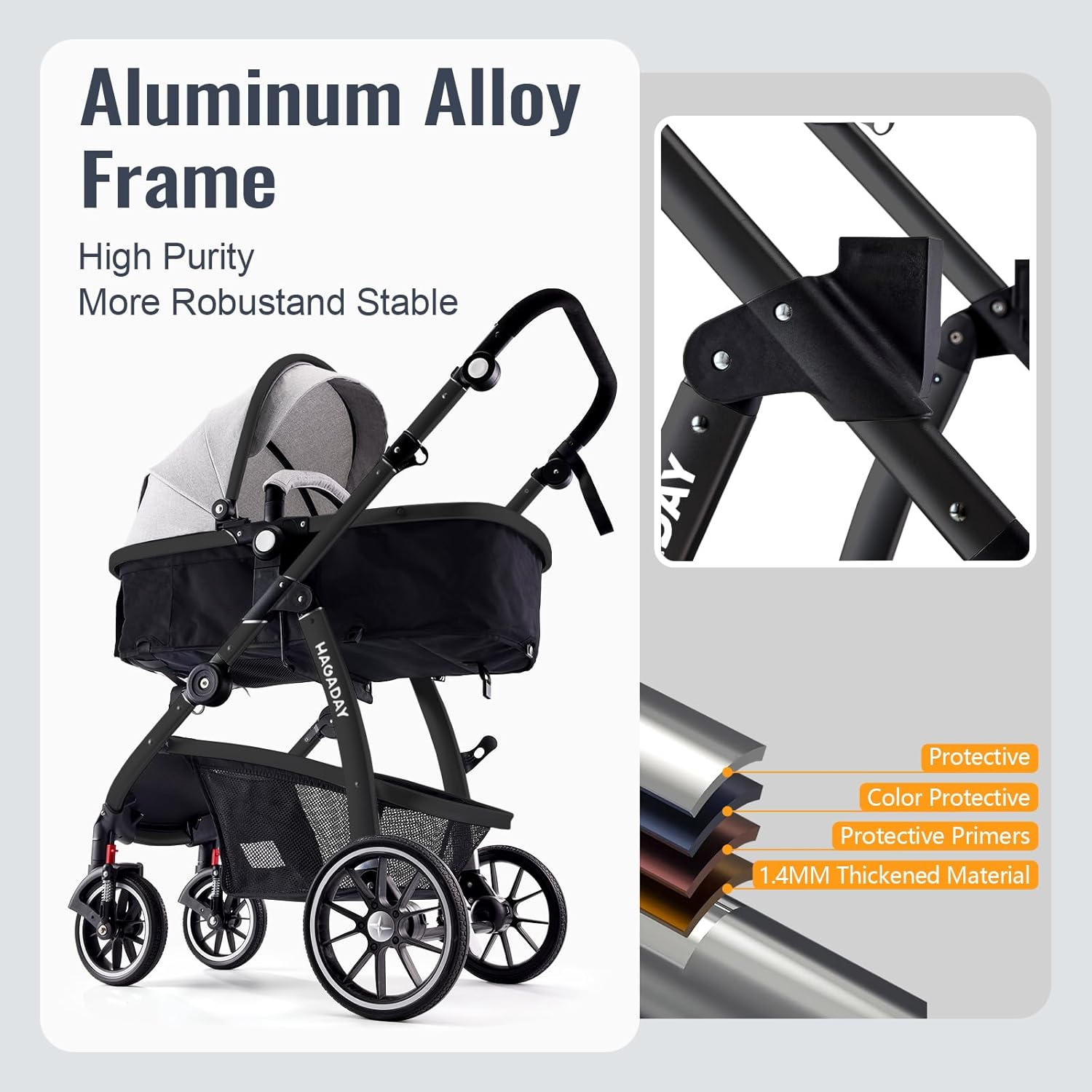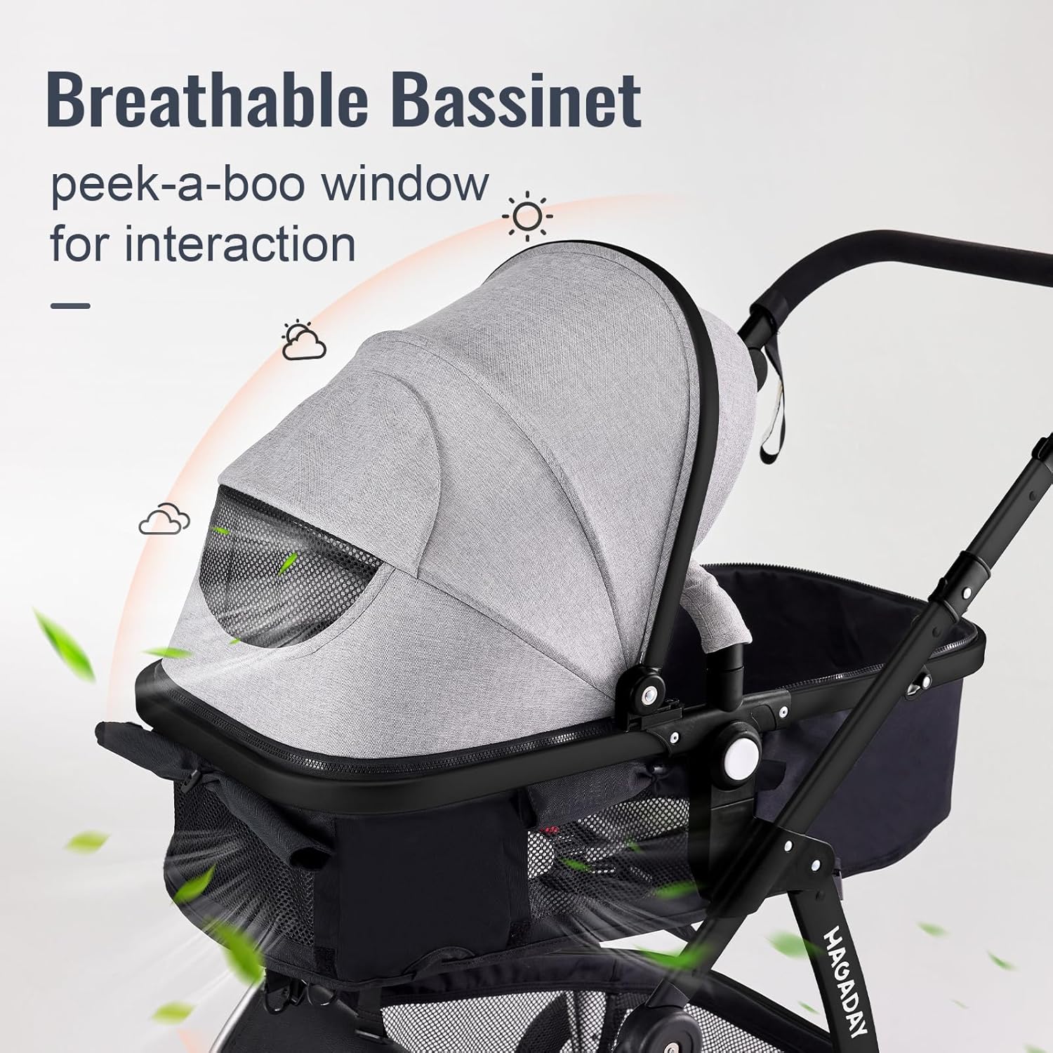 - SUPERIOE BABY CARRIAGE: The Hagaday baby stroller surface is made from baby-friendly fabric that is skin-friendly and breathable. The soft cushion in the baby bassinet ensures comfort, and a foot cover provides warmth during colder weather.