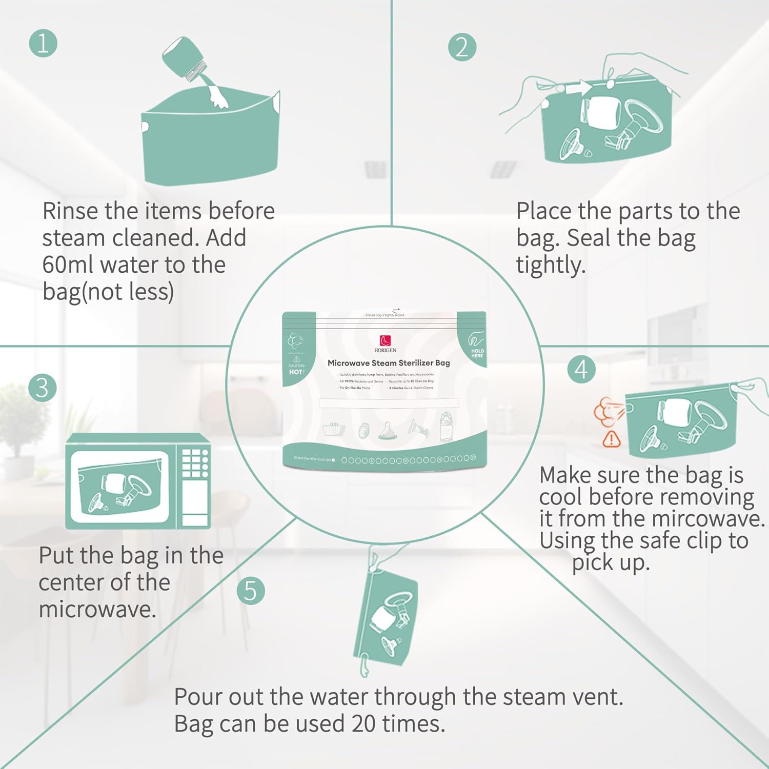 - Enlarged size: The existing microwave bags were expanded to accommodate more baby products. Horigen bottle bags hold up to two 8 oz Bottles and two 5 oz Bottles along with parts. (Please confirm whether the product is microwave-safe before use)