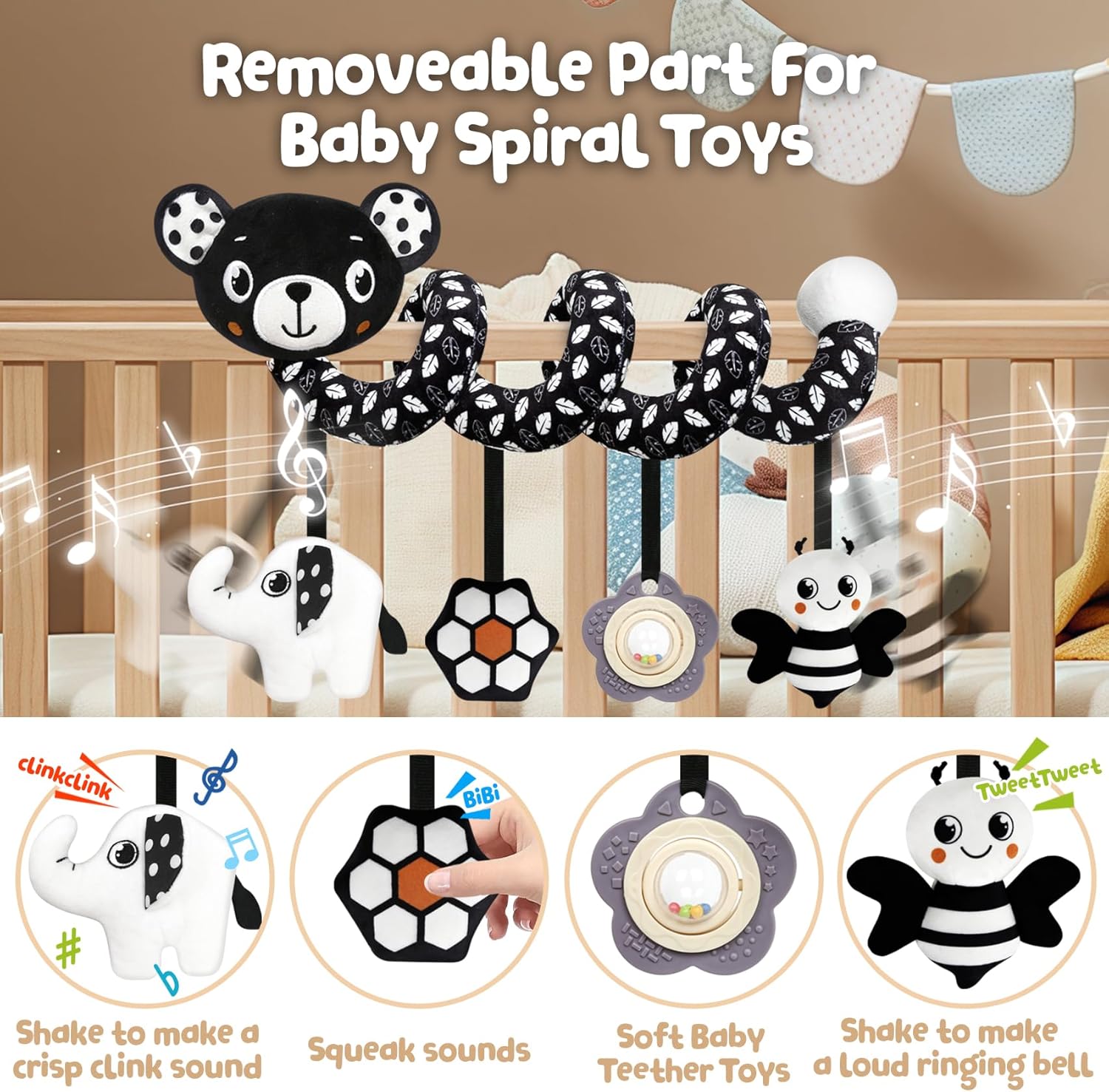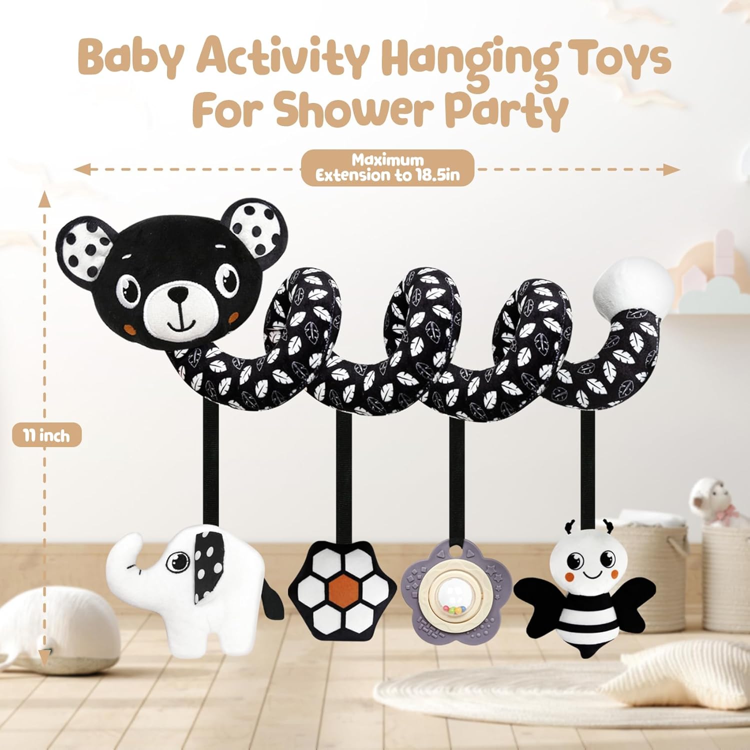 - STROLLER TOYS FOR BABIES:High-contrast black and white cartoon patterns can attract newborns' fuzzy eyes and stimulate the development of their visual senses.