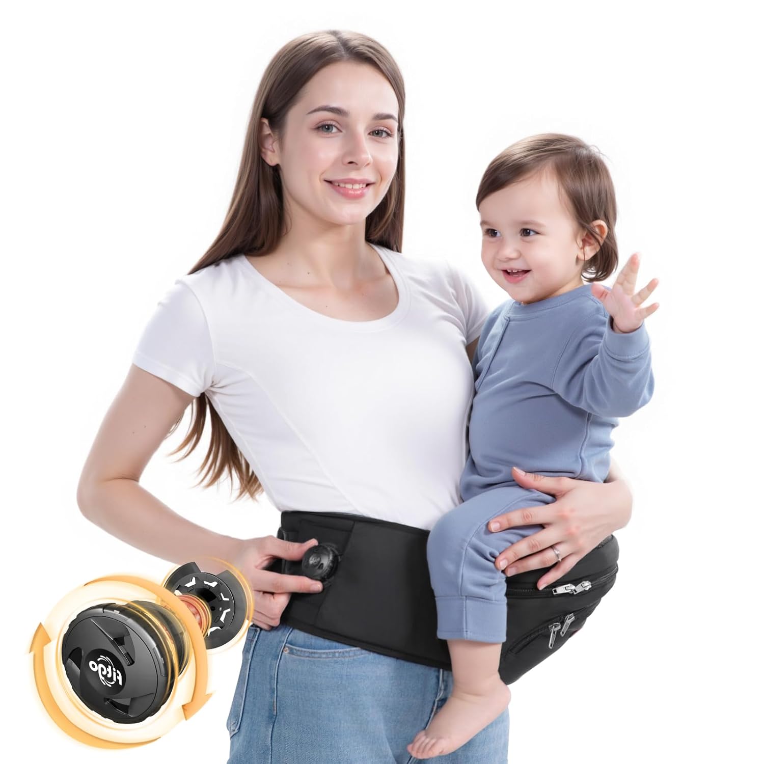 - Upgraded Waist Tightening Method: The unique Fitgo knob allows for easy adjustment by pressing and rotating, enhancing comfort and reducing pressure on the waist and abdomen. The 166° angle design of the waist belt is more ergonomic, ensuring a snug fit without worrying about slipping. The baby hip seat carrier features an extended and widened nylon buckle, accommodating family members with different waist sizes