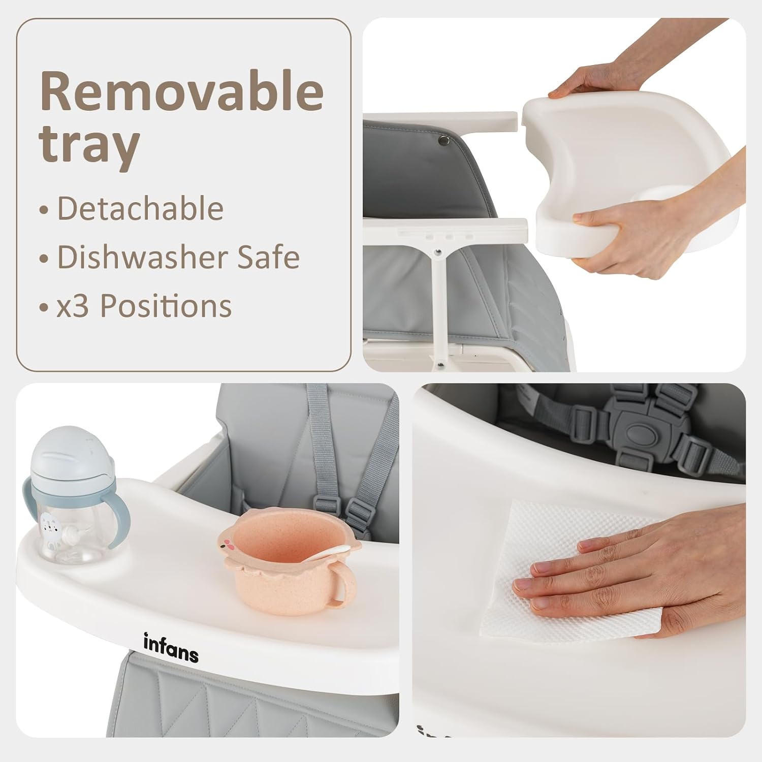 - Easy to Clean: Our baby travel high chair come with removable trays and cushions for easy cleaning and maintenance after daily use. The removable PP tray is dishwasher safe. The PU leather cushion is waterproof and all you need to do is wipe the stain with a clean cloth.