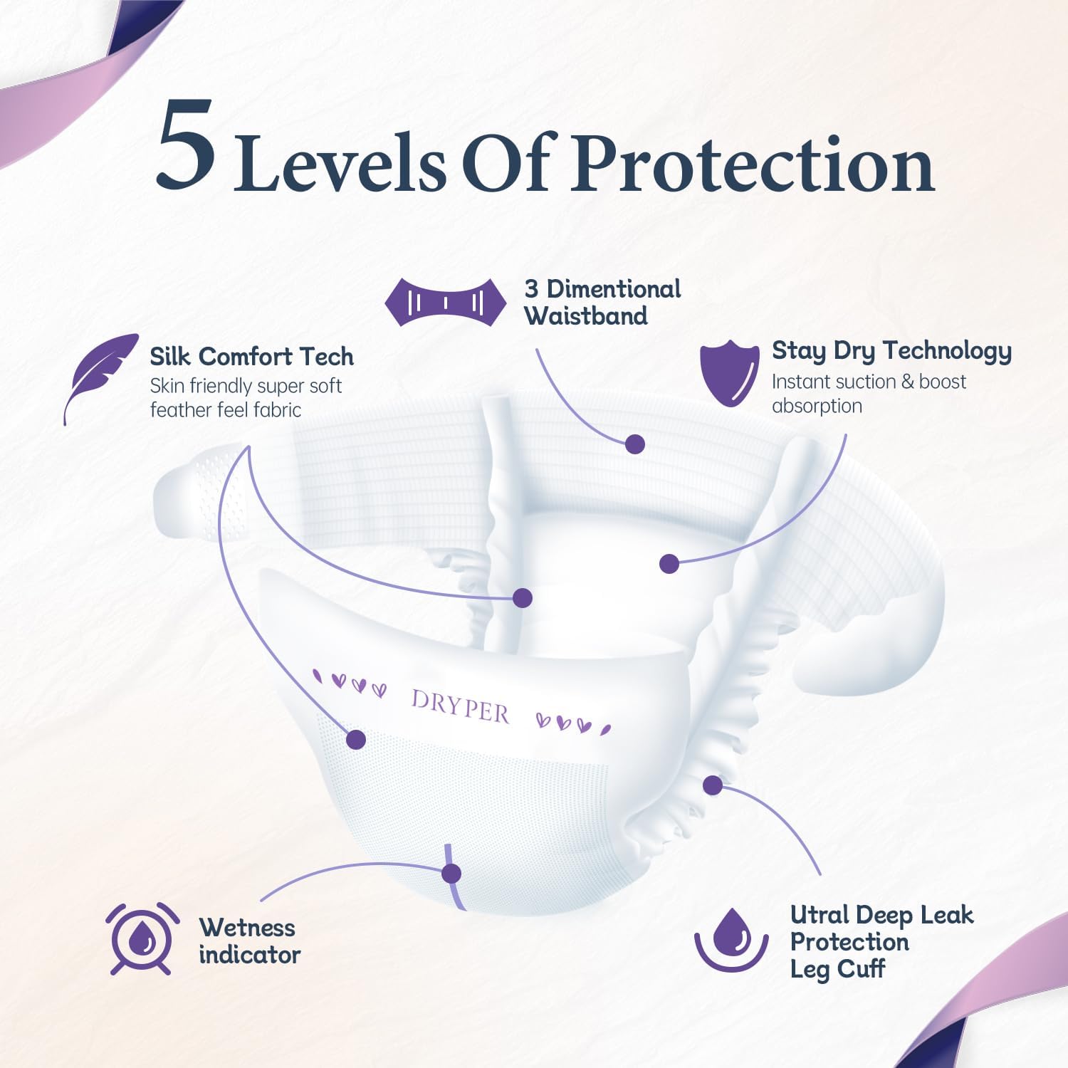 - Super Fast Absorption For Dryness----Dryper diapers quickly absorb moisture,preventing wetness from staying on the surface.The multi-layered absorbent system distributes and locks moisture evenly,ensuring your baby stays dry,especially during long periods of wear,such as overnight.Comfortable Sleep.This feature helps reduce discomfort and ensures a dry,peaceful sleep for your baby.