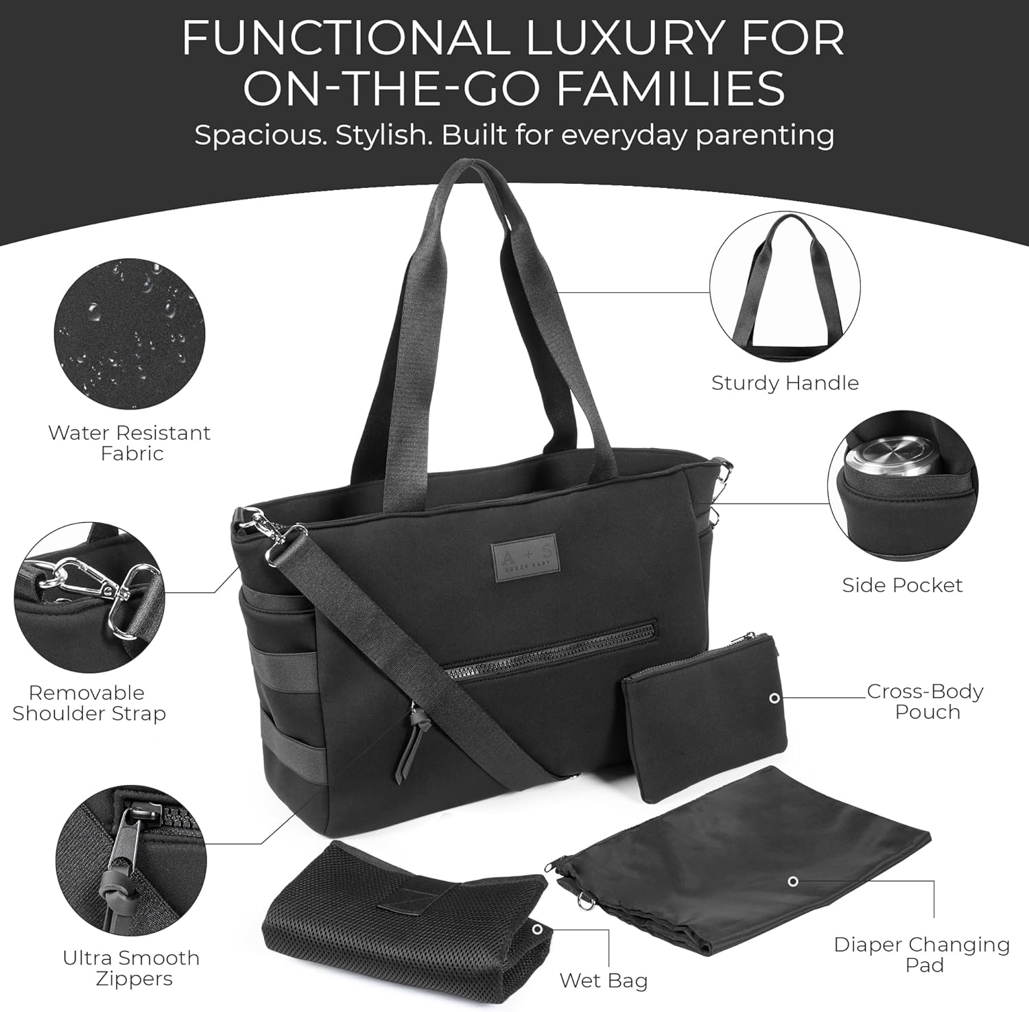 A + S Luxxe Diaper Bag Tote – Stylish, Large Baby Bag with Stroller Straps, Insulated Pockets, Changing Mat & Waterproof