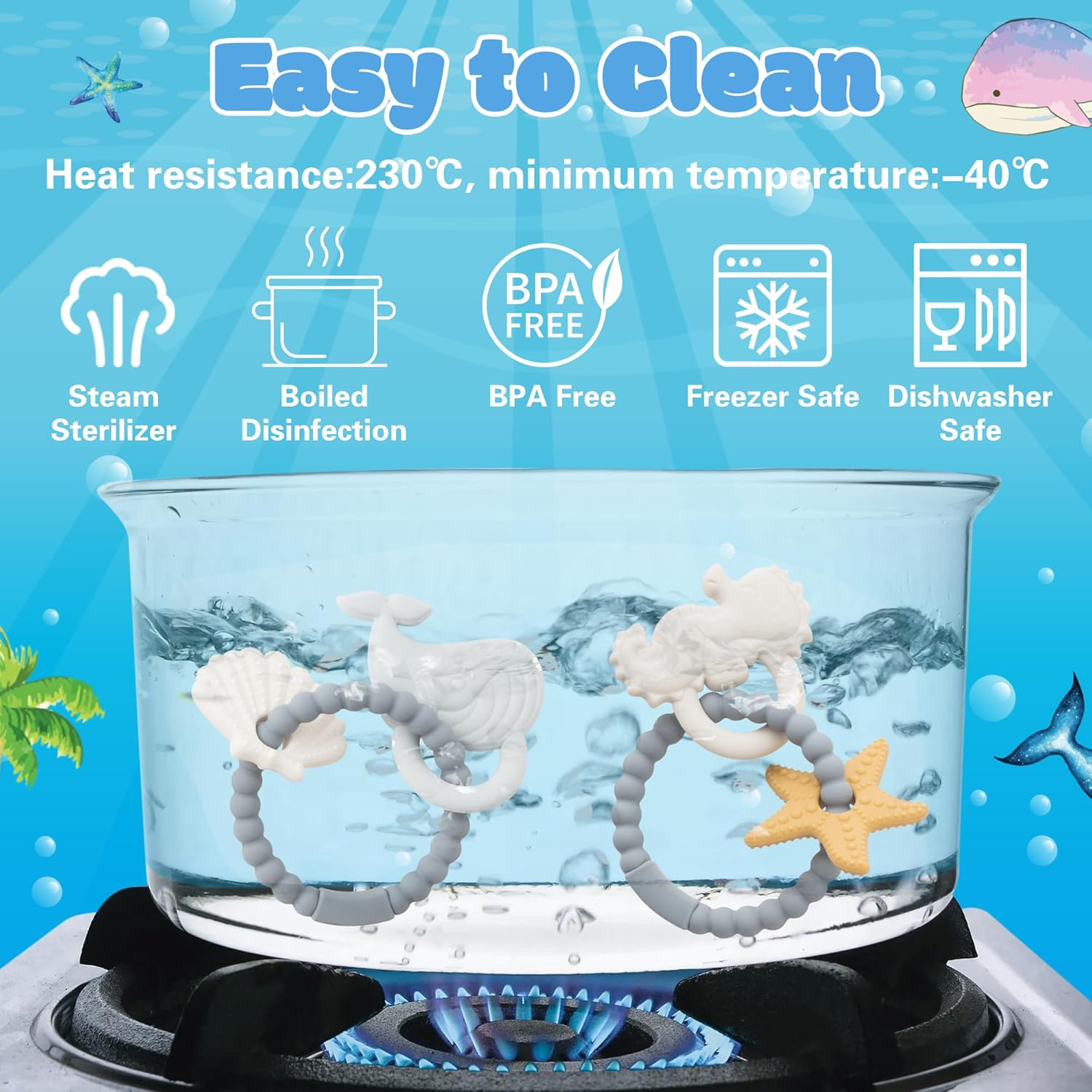 - EASY TO CLEAN: Before using our teething toys, it is recommended to sterilize them in boiling water for 2-3 minutes. After each use, they can be easily cleaned in the dishwasher or with warm soapy water. Our adorable silicone teething toys are heat resistant from -40°C to 230°C and can be boiled, autoclaved or refrigerated, so you can use them with confidence and wash them easily.