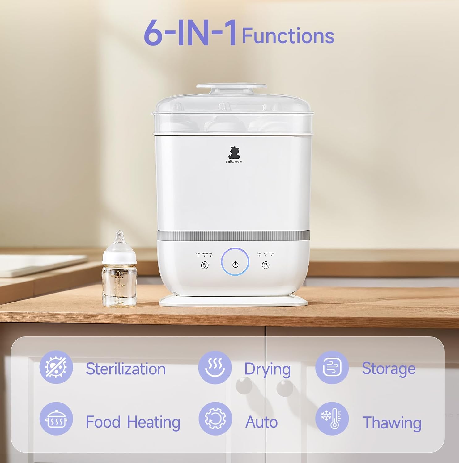 - All in One: This 6-in-1 design offers sterilization, drying, thawing, food heating, storage, and auto—all in one appliance. It meets all your baby care needs in a single, efficient device