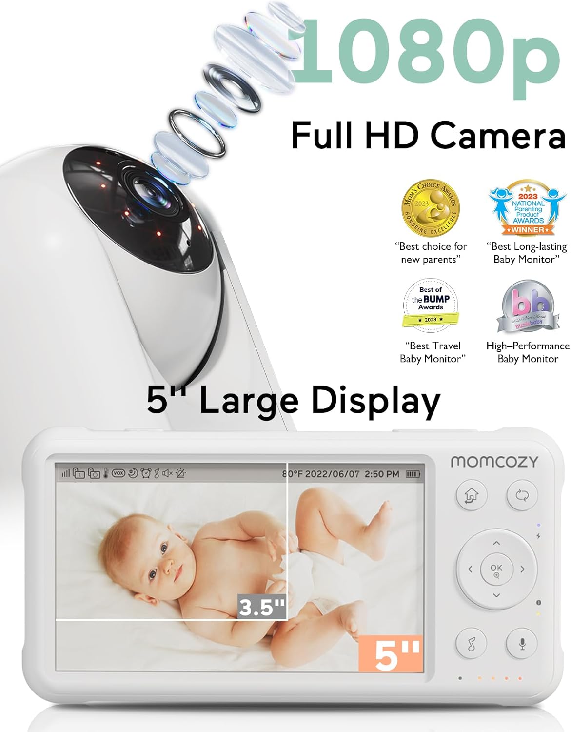 Momcozy Baby Monitor with 2 Cameras 5’’ 1080P Split Screen Video Baby Monitor with Camera and Audio no WiFi for Baby Safety 5000mAh Battery Infrared Night Vision 2-Way Audio 960ft Range Ideal Gift