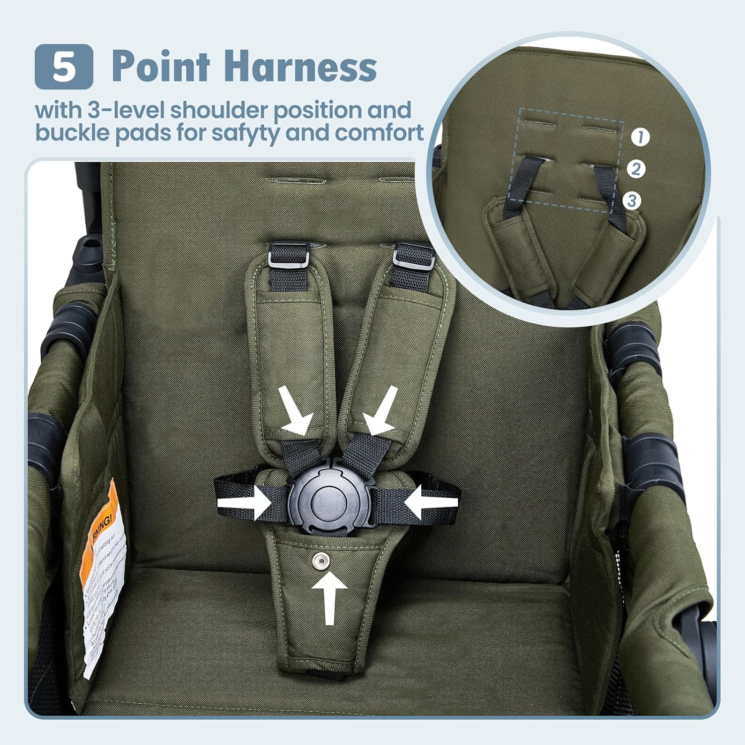 - Comfortable and Safe Design: The toddler wagon stroller featuring 5-point safety harnesses to ensure children's safety, and the seats are padded with foam to make babies sit more comfortably during the ride. The high seats design gives babies more foot space and won't make them feel cramped. Enlarged foot brakes to prevent the wagon from rolling away when parked, safeguarding your kids in all aspects