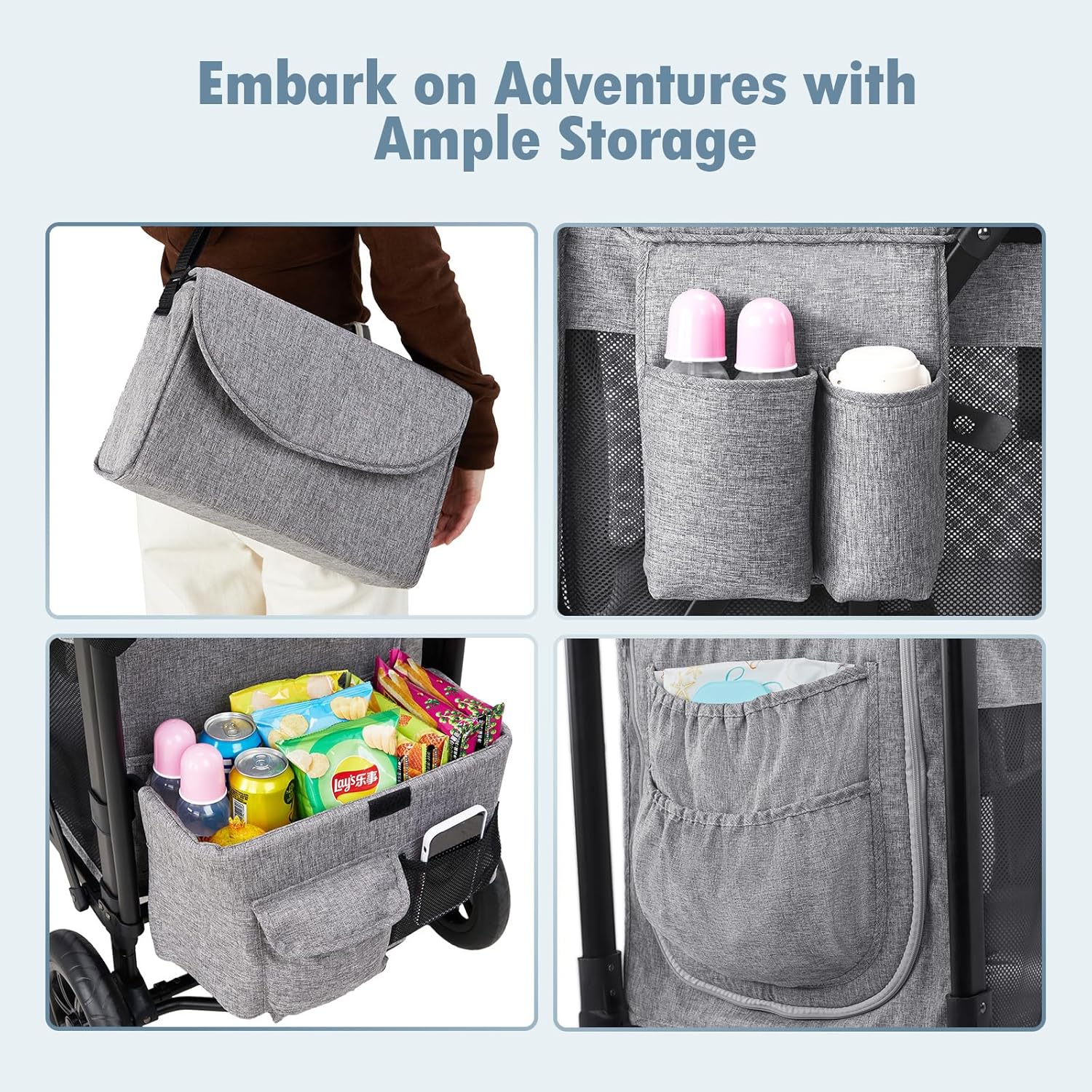 - Ample Storage Space: There are cup holders on both sides of the baby wagon, where water cups or baby bottles can be placed. A large storage basket at the back that is convenient for storing snacks, toys, diaper bags and other items. Two open pockets on the front side. Additionally, a large-capacity 14.1”L x 5.5”W x 9.45” H shoulder bag is provided as an extra. Such thoughtful designs can meet the needs of daily outings or travels