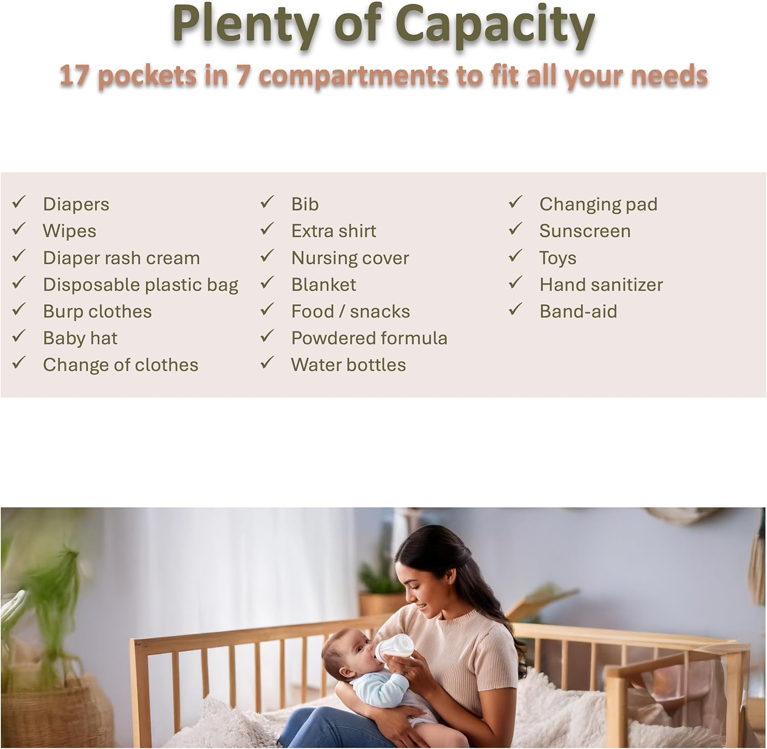 - Pacifier Pouch, Portable Changing Pad – The detachable pacifier pouch can easily hold 2-3 pacifiers keeping them clean and accessible. A 23” x 13” changing pad with thick padding for the comfort of your baby. The changing pad has a built-in pocket for diapers, a pocket for wipes, and a third pocket for mom’s essentials and a strap for easy carrying.
