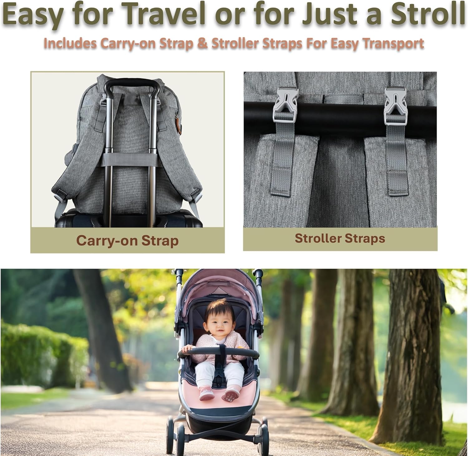 - Designed for Hands-Free Carrying – The ergonomic and thick padded shoulder straps will bring comfort while carrying the backpack, even for extended periods. Two strong built-in stroller straps and clips in the back of the backpack can be used to attach the bag to the stroller. A luggage strap in the back is for travel convenience.
