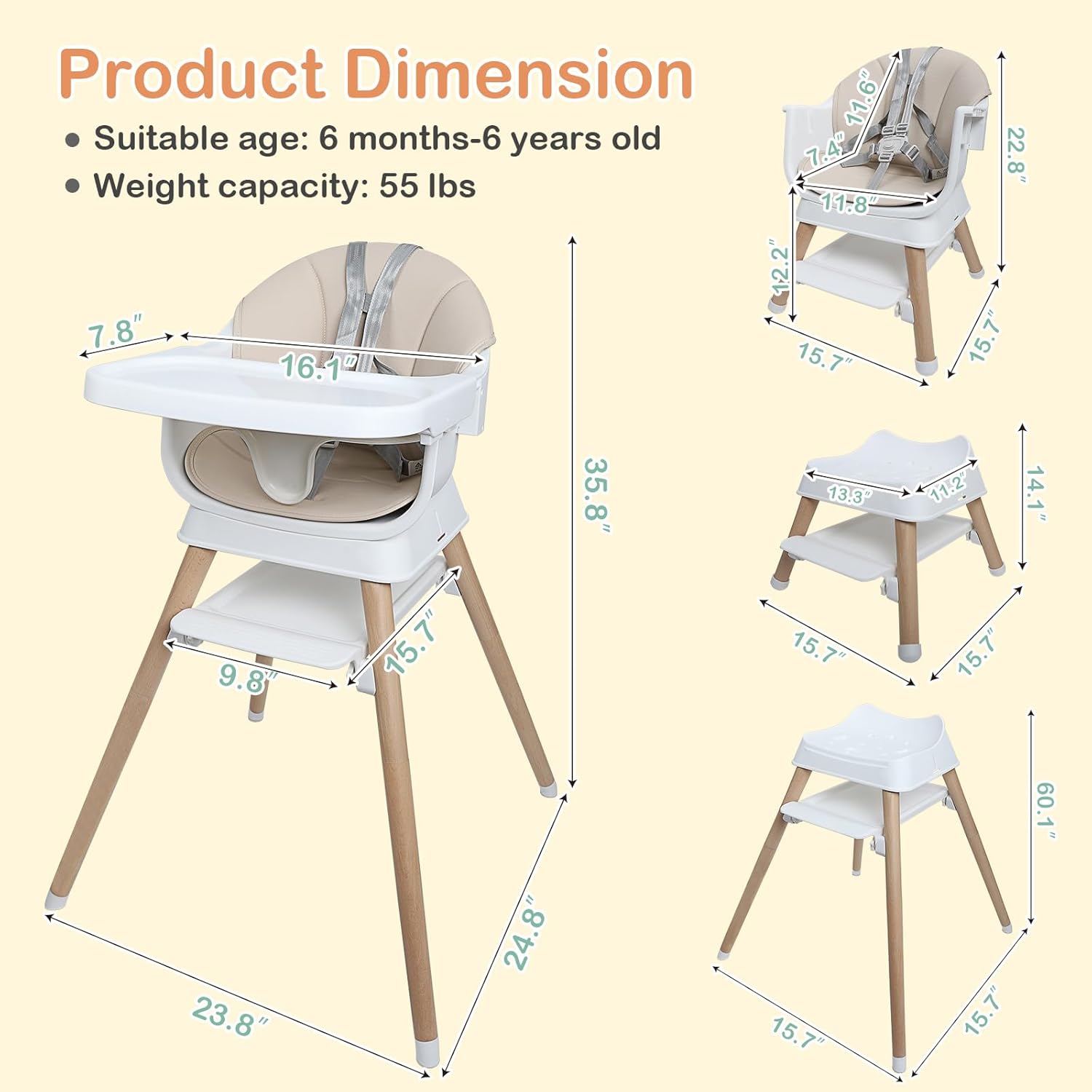- Safety You Can Feel, Not Just See: Built in a stable pyramid structure, this convertible baby high chair is not easy to tip over. 4 sturdy legs are made of solid beech wood with anti-slip foot pads. Besides, there is a 5-point safety harness and an anti-falling baffle to protect your baby from sliding off from the chair