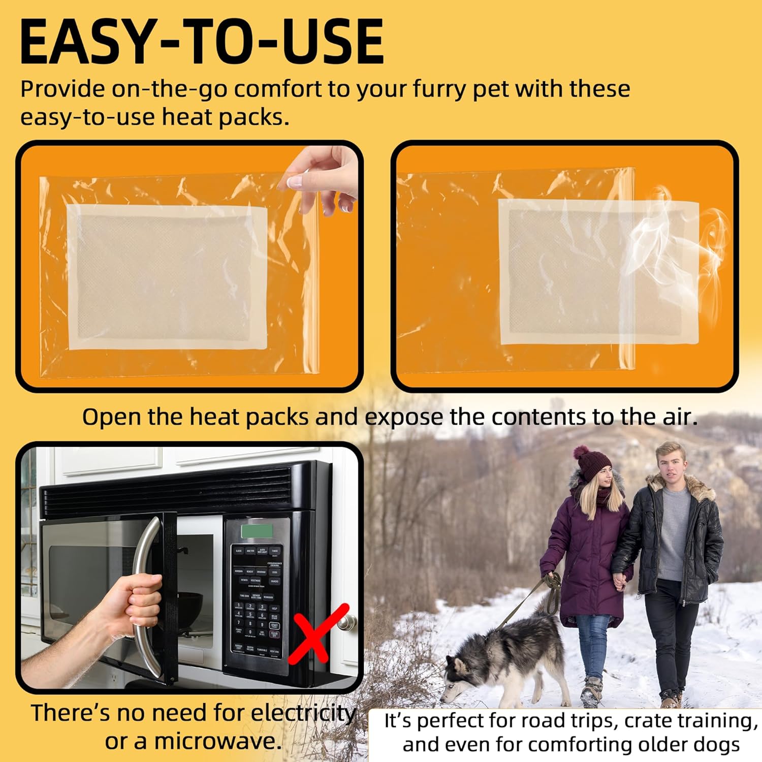 - Easy to use disposable warmer - Provide on-the-go comfort to your furry pet with these easy-to-use heat packs. Open the heat packs and expose the contents to the air. There’s no need for electricity or a microwave. It’s perfect for road trips, crate training, and even for comforting older dogs