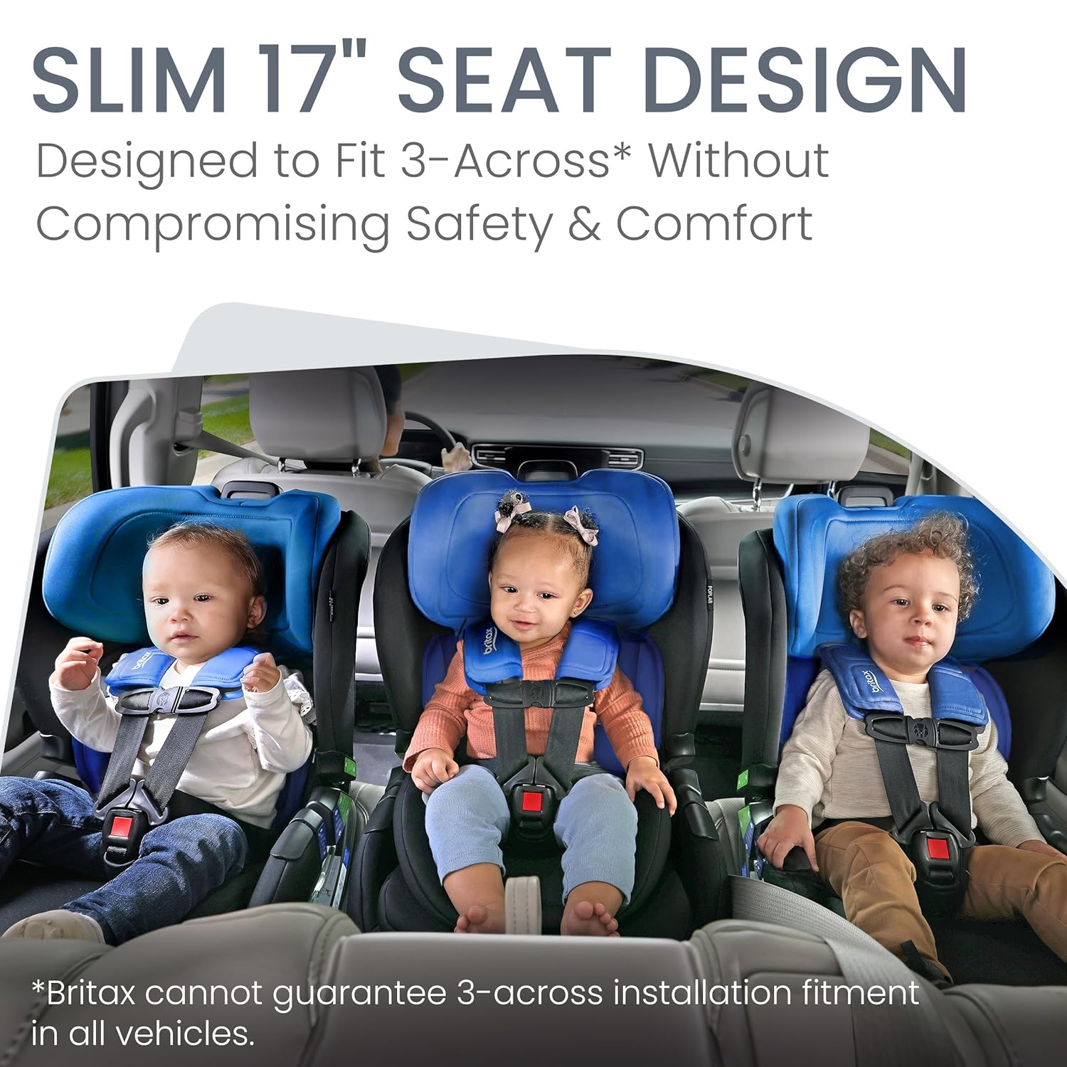 - SpaceSaver Design: Slim 17" seat is designed to fit 3-across* in certain vehicles without compromising on trusted Britax safety and premium comfort. *Britax cannot guarantee 3-across installation fitment in all vehicles