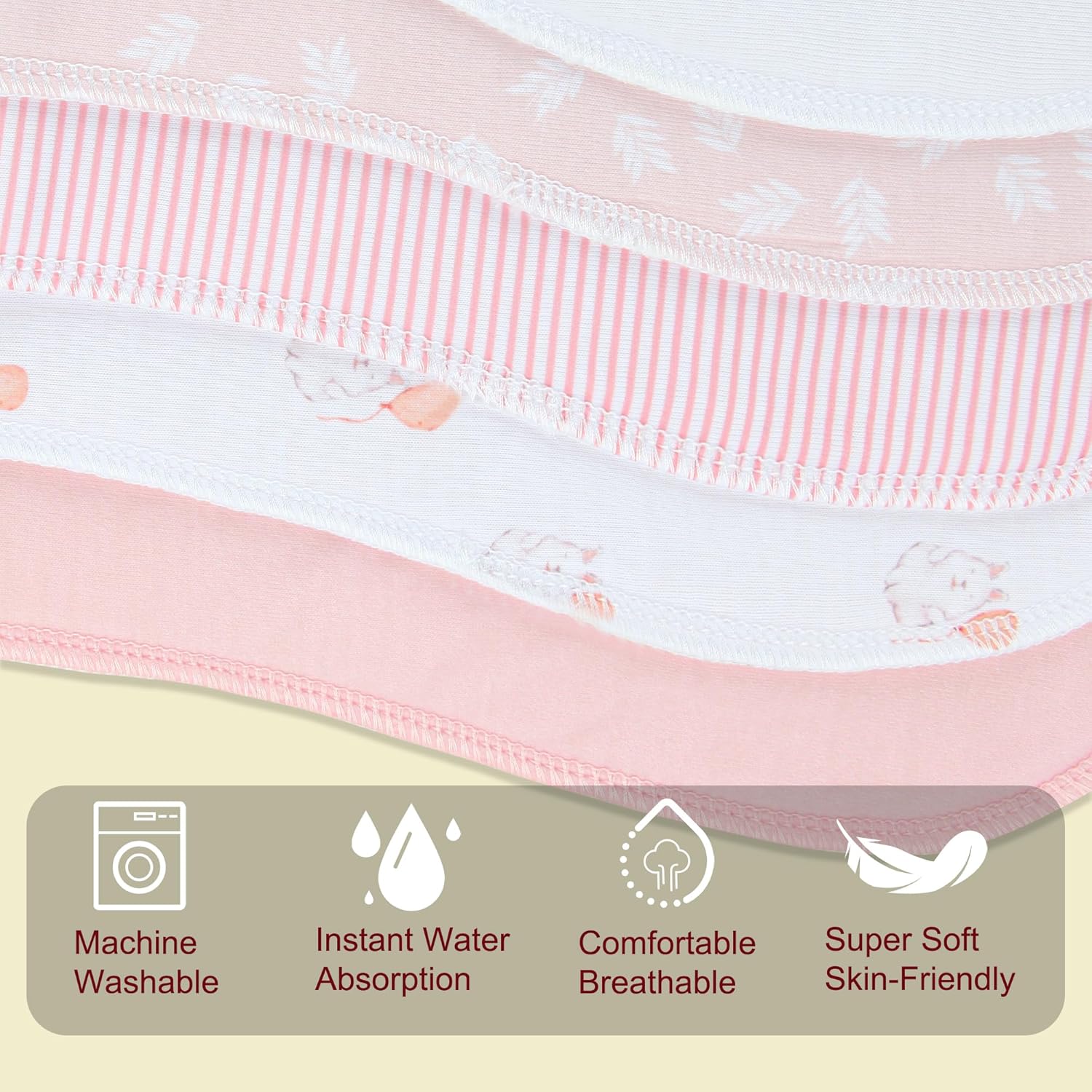 - 🌿 Ultra-Soft 100% Cotton & 3-Layer Absorbency Experience superior comfort and protection. Made with 100% natural cotton on the front and back for gentle touch on baby's skin, plus a super-absorbent polyester fleece middle layer. This 3-layer construction quickly soaks up spit-up and drool to keep your baby and your clothes dry all day.