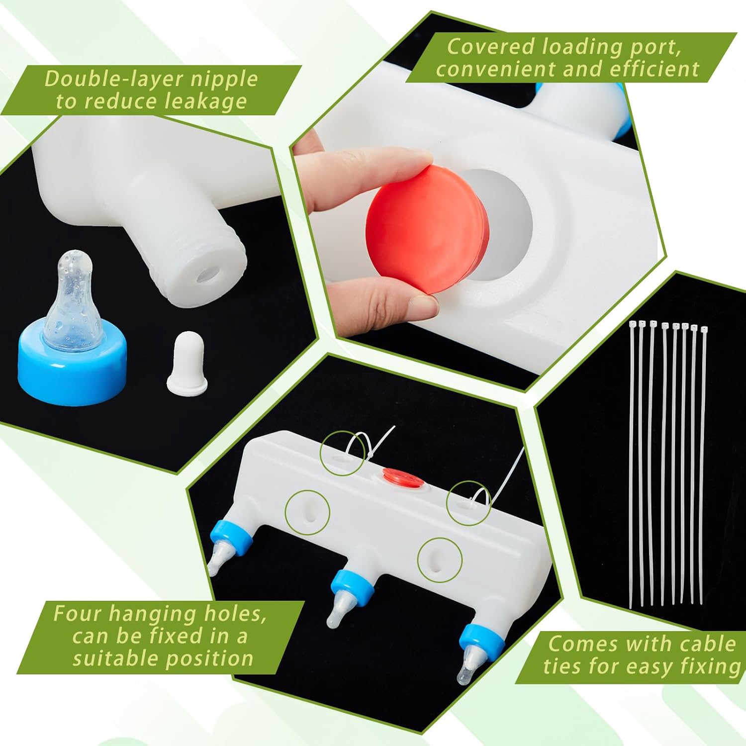 - 3 Pacifier Design: our feeder design has three pacifiers, which can not completely avoid leakage, but can reduce the amount of leakage; The design of three pacifiers can allow multiple animals to eat at the same time, feed efficiently, and avoid cross-infection; You can also adjust the amount of milk according to the age and needs of the lamb to avoid over-feeding or under-feeding