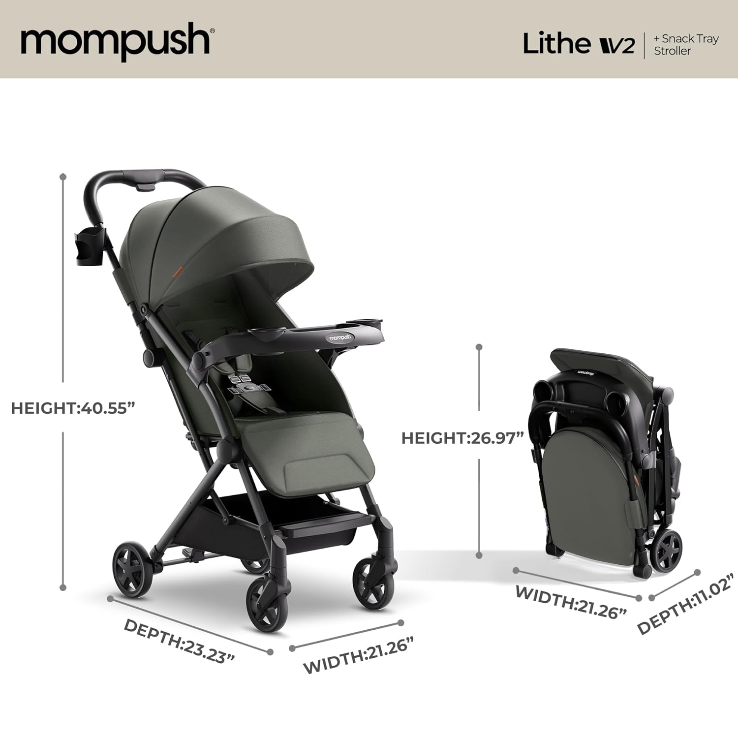 Mompush Lithe V2 Lightweight Travel Stroller, Compact Foldable Baby Stroller with Travel Bag, One-Hand Fold Stroller, Snack Tray, Mechanical Recline Seat, Airplane-Ready, Organizer & Rain Cover