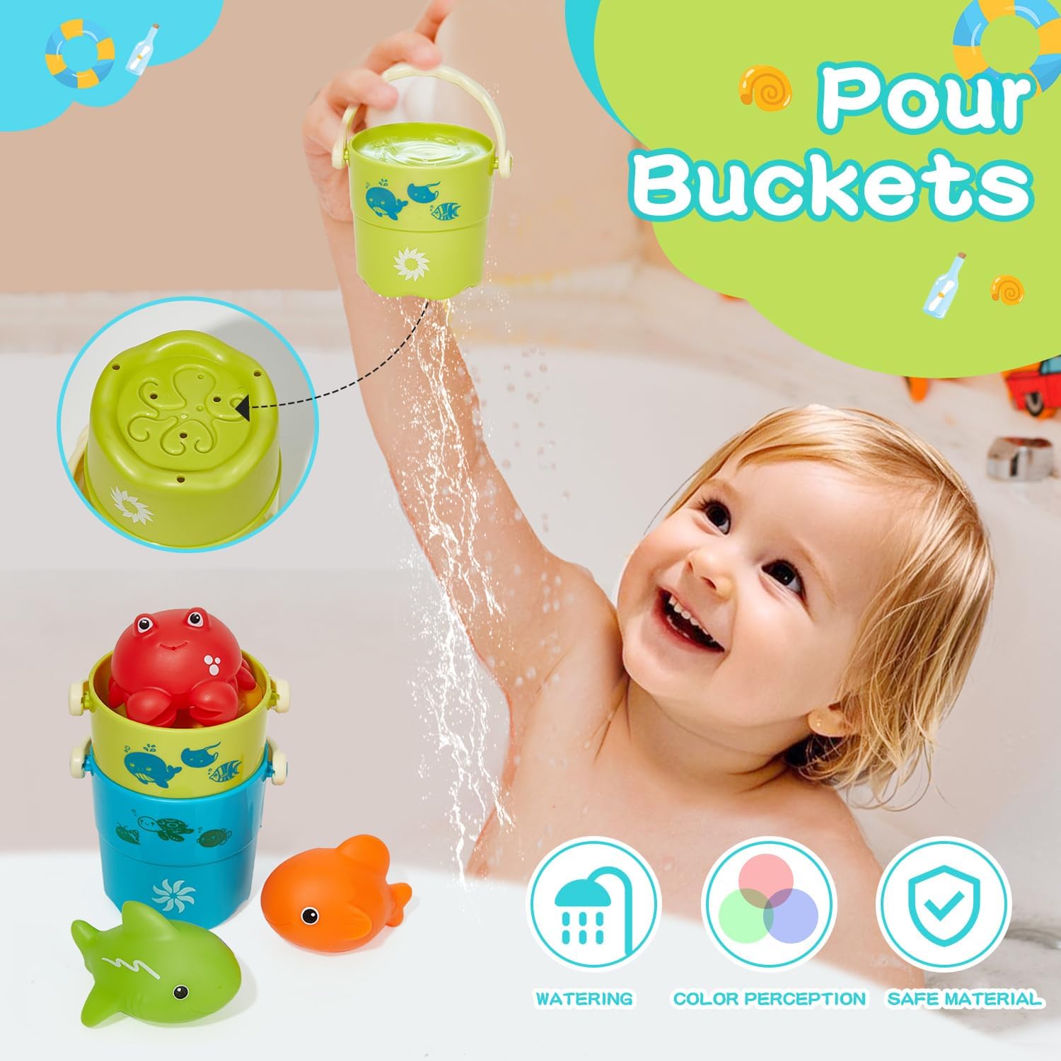 - 26PCS Bath Toy Set: The toddler bath toy set includes 2 fishing rods, 2 bucket, 2 spoons, 6 floating boats, 6 no hole bath toys and 8 fishing toys, the size of the product is designed specifically for babies's small hands.To help parents store this kids bath toys, we have eqiupped an adsorbable drying mesh bag
