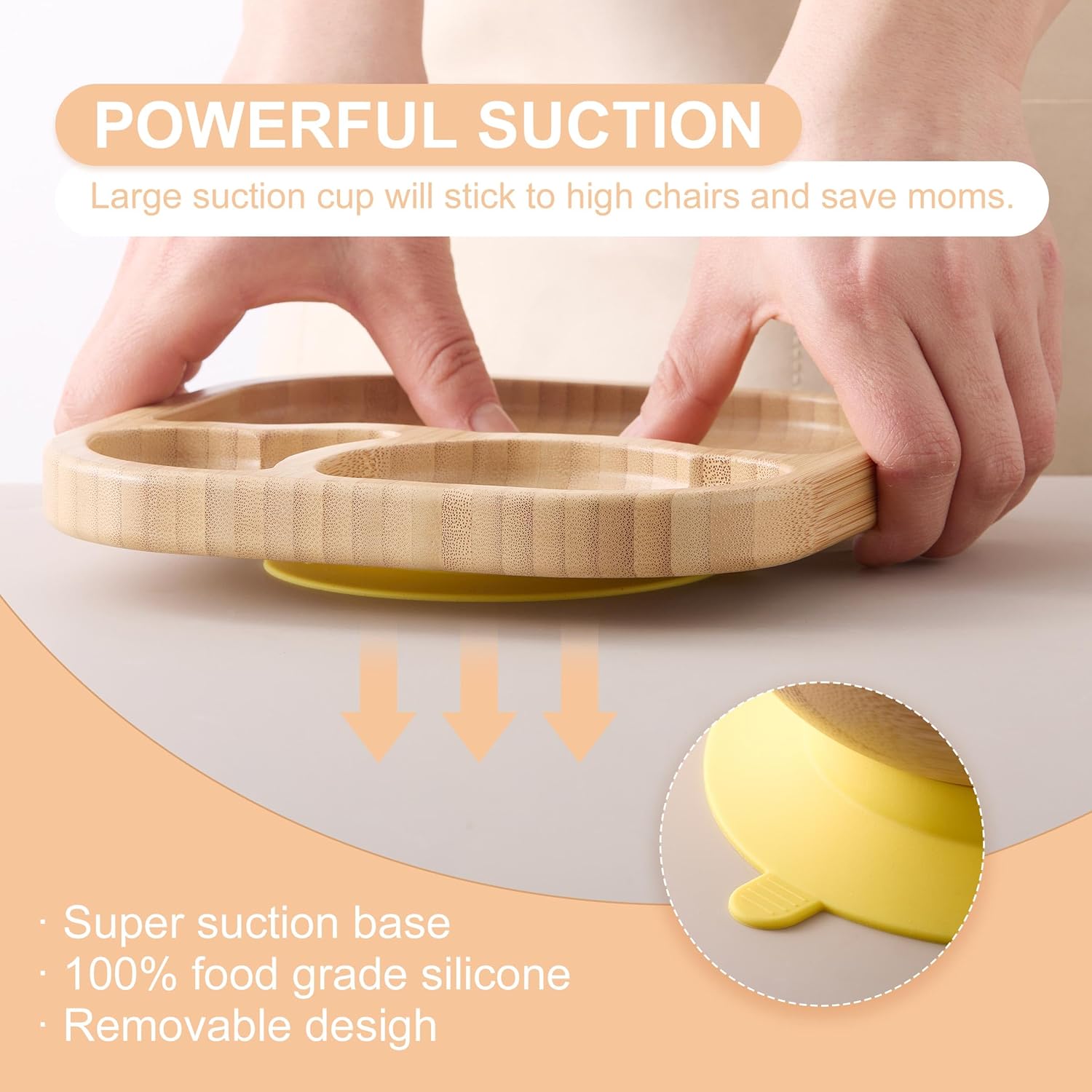 - NON-SLIP BOTTOM - Bamboo plates and bowls with strong suction base stick to any non-porous surface to prevent mess. With quick release tab for easy removal.