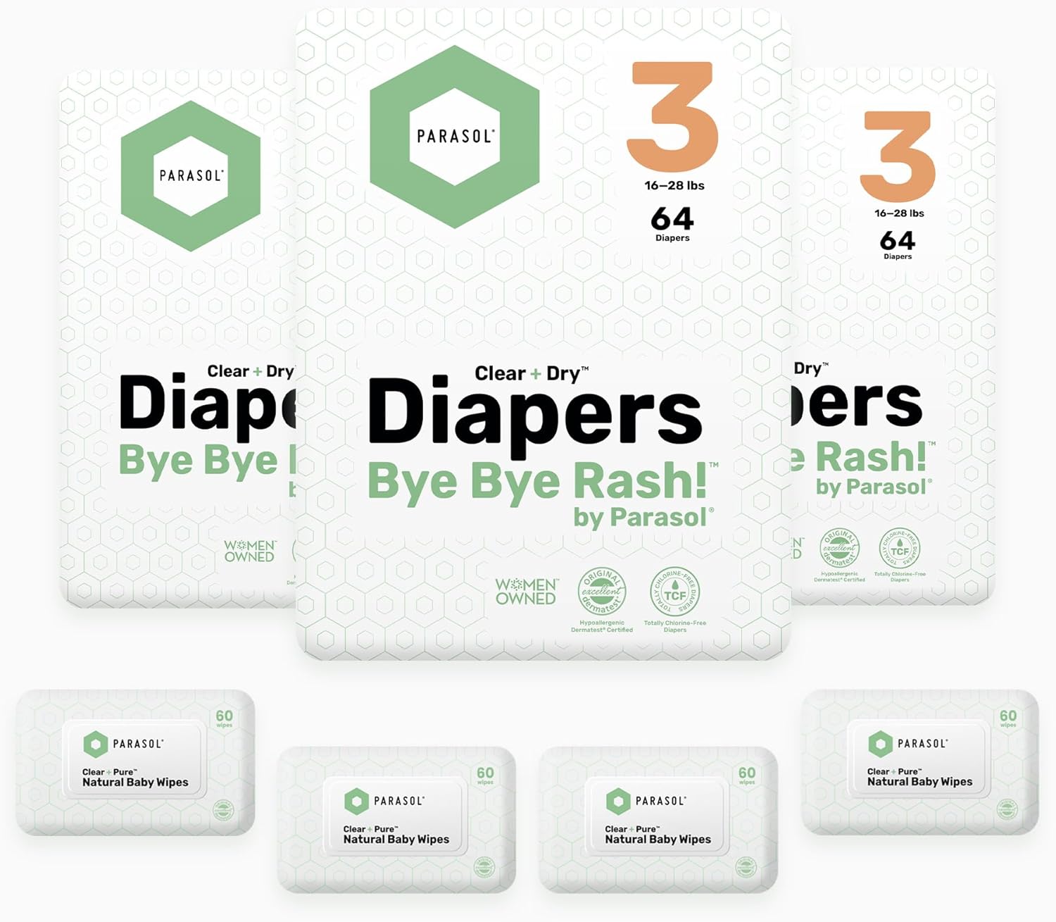 Parasol Clear+Dry Disposable Diapers and Clear+Pure Wipes, RashShield Protection, Size 3 (16-28 lbs), Diaper Bundle of 192 Diapers & 240 Wipes