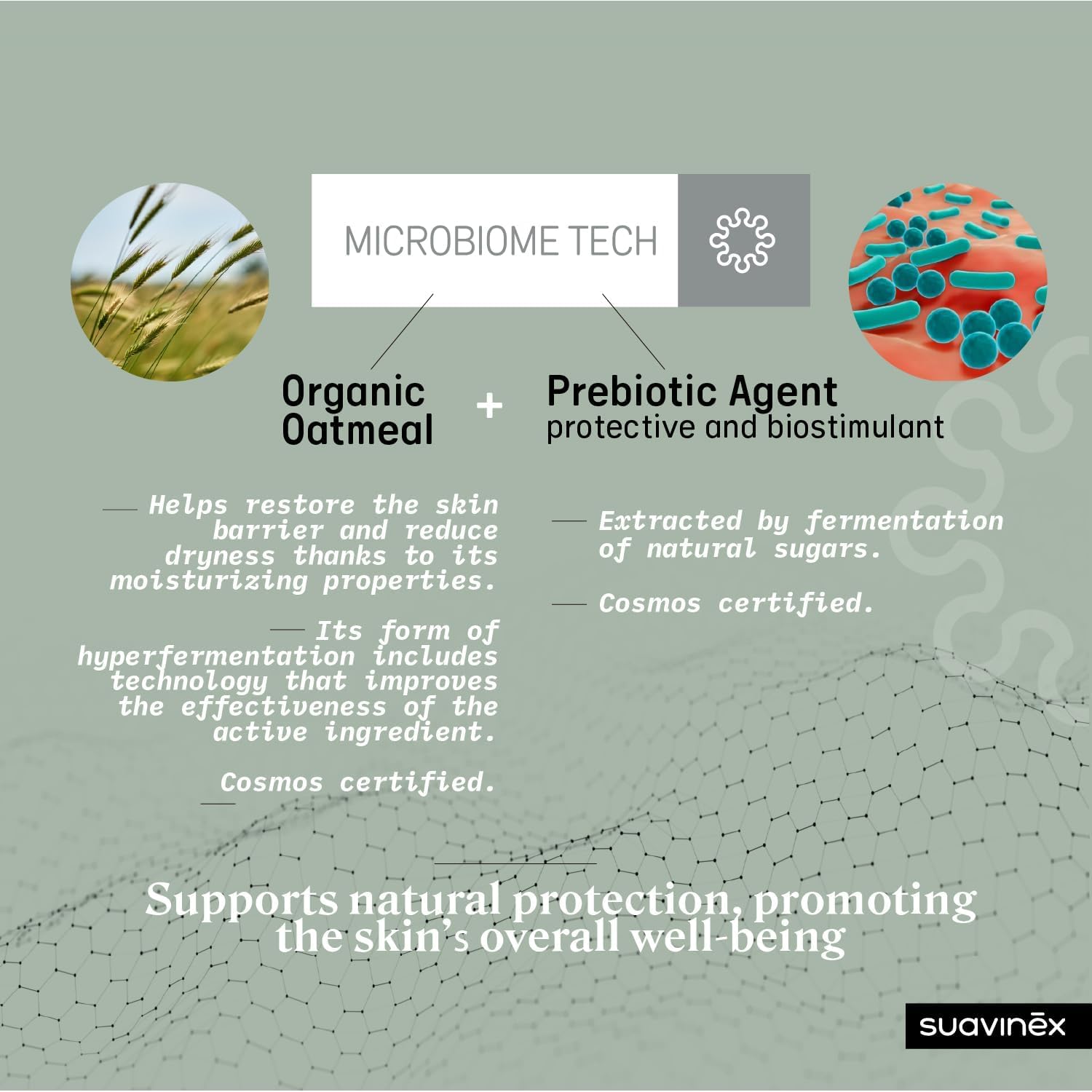 - Microbiome Tech - our exclusive formula inspired by the skin microbiome, is made with organic oatmeal and prebiotic agents support natural protection, promoting the skin's overall well-being.